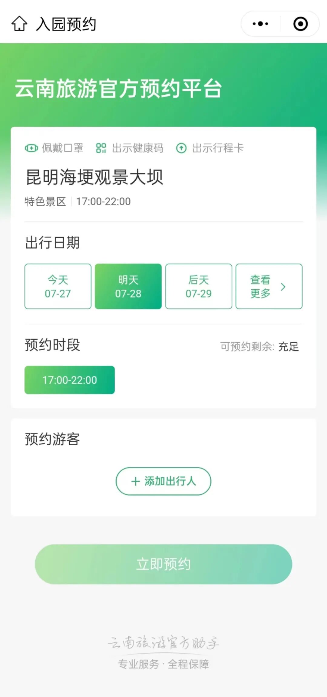 度假区文旅投促局相关负责人介绍,为了做好疫情防控工作,市民和游客可通过“游云南”微信小程序进行入园预约。预约成功后,生成预约码。
