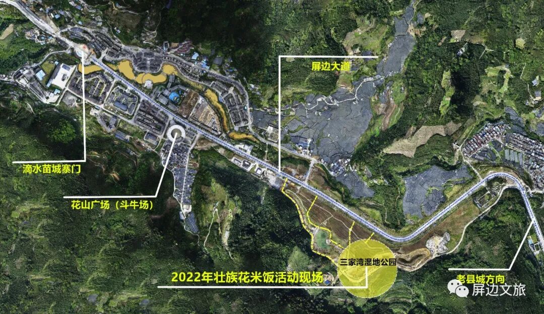 三家湾湿地公园:位于屏边县城与滴水苗城之间,总面积1.5平方公里,距离本次系列活动举办地仅一步之遥,是目前红河州最美的湿地公园之一,也是屏边牧羊河水系中最大的一个湿地公园。目前湿地公园已经建设有完善的休闲步道、休息亭子、湿地水景观、花海植物园,同时新建了部分网红打卡景观小品,是您感受屏边盛夏清凉与神奇不可多得的好地方。体验路线:滴水苗城向东经花山广场至空中苗城右转即可到达。
