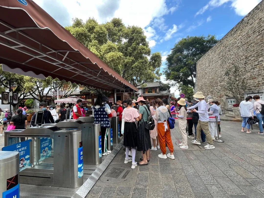 近日,在大理古城南门,在志愿者的引导下,游客通过扫描“游云南”APP进行景区预约服务,得到一个预约码后,直接扫描通过闸机进入古城游览。“一码通游”既省去了以往进景区既要核验预约码又要查看健康码的不便,也有效避免了景区入口出现人群聚集。