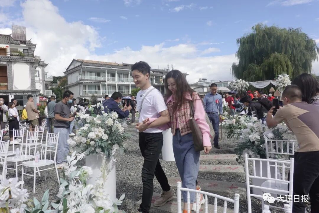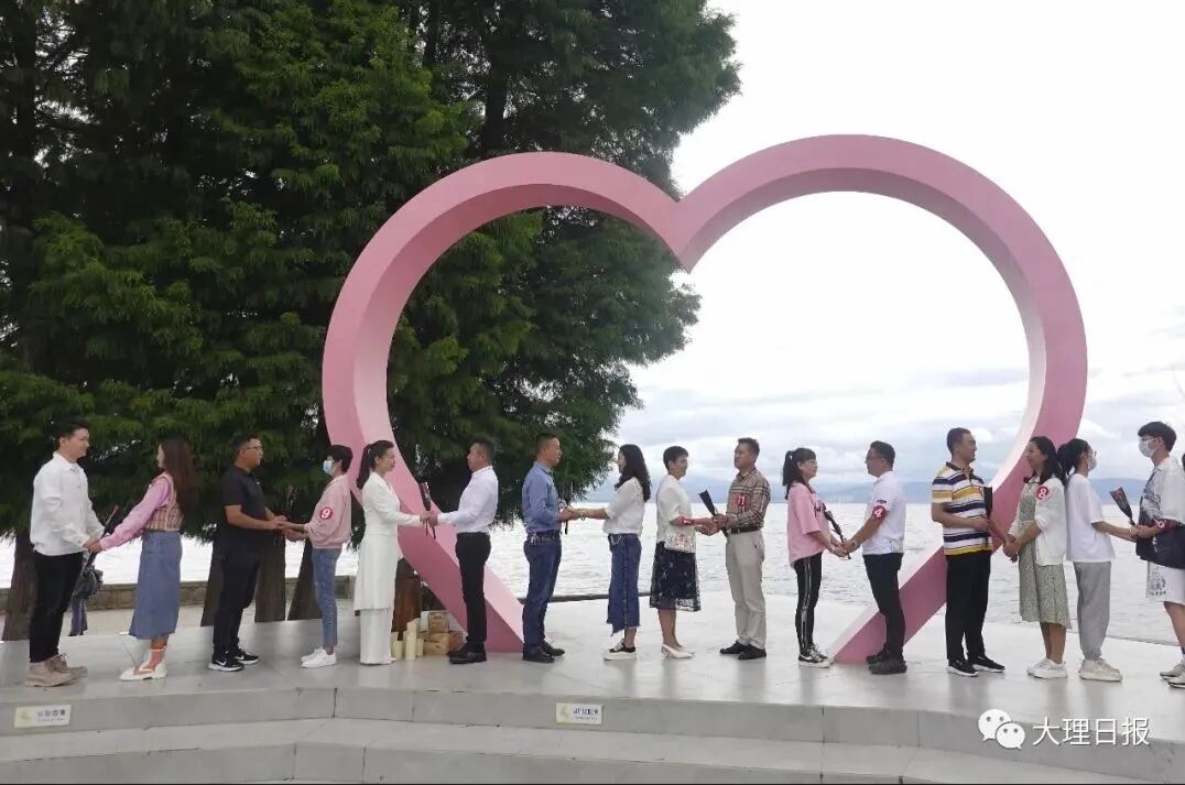 “七月的风,八月的雨,幸运的我终于在这儿遇见心爱的你。邀苍山为盟,洱海为誓,在这水波温柔的八月,来赴一场爱的邀约。” 8月3日,在大理市龙龛古渡,33对情侣进行爱情表白。