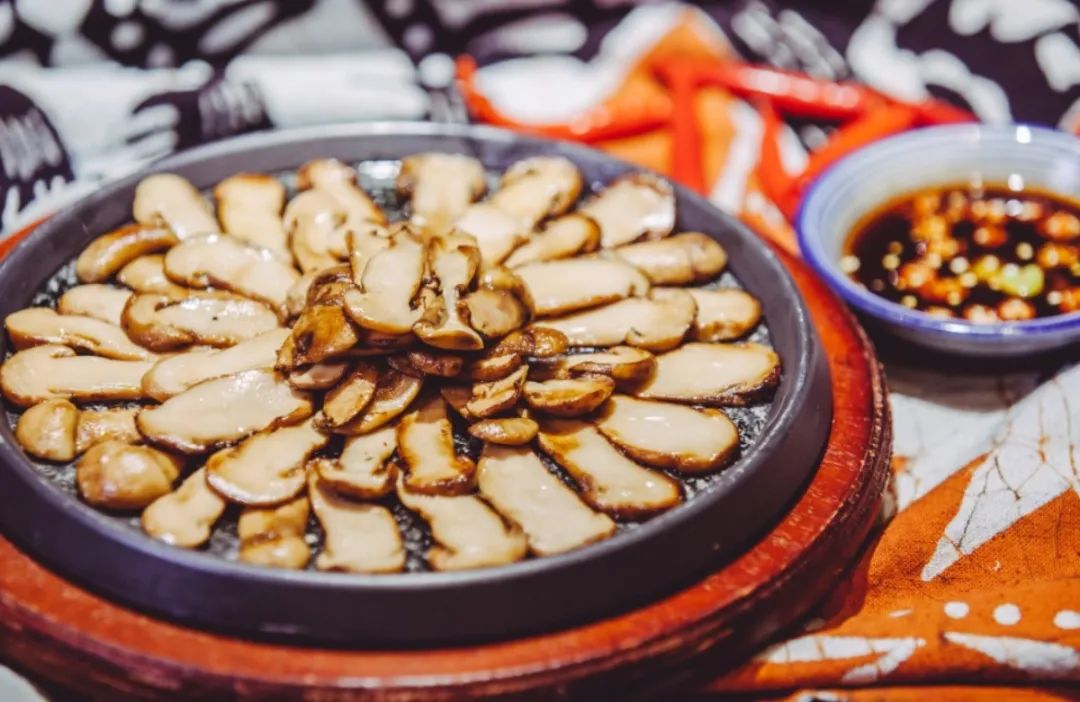 而所有菌子中最令人期待的,还要数至鲜美味——松茸。松茸刺身、酥油煎松茸、烤松茸、松茸炖鸡……在巴拉村大厨们的手中,新鲜出土的松茸被变换成不同的菜品,与当地酥油、火腿、辣椒的搭配也让人们品尝到了100%的当地味道。