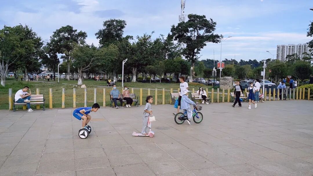 年轻人则占领了更外围的区域,玩滑板的少年如风一般来去自如,只留下轮子滑过石板的急促“嗒嗒”声。小朋友们也不甘示弱,在家长的指导下,骑着小小的可爱的自行车,“哼哧,哼哧”在广场外围转圈。