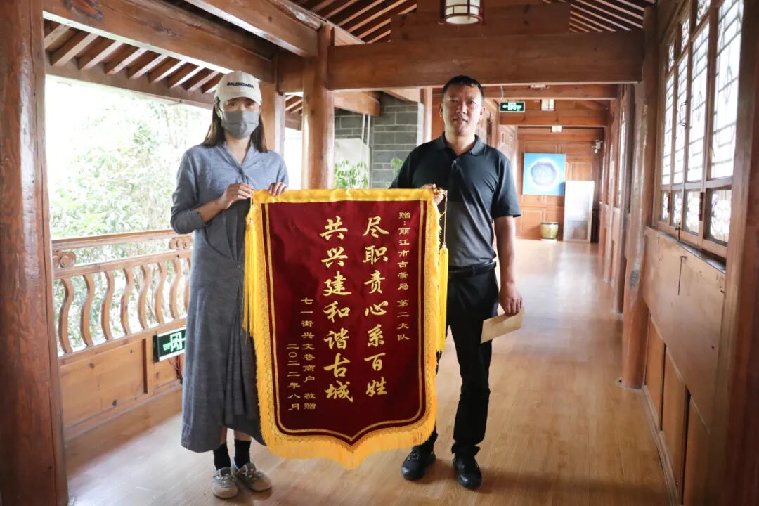 丽江古城保护管理局副局长木晟代表古管局接受感谢信和锦旗,对商户给予的肯定表示感谢,疫情之下,古城的经营户和管理者用爱心和责任心共同守护古城,合心合力共谋发展。接下来,丽江古城保护管理局将持续提升景区服务质量,共同为广大游客提供更加优质的服务。