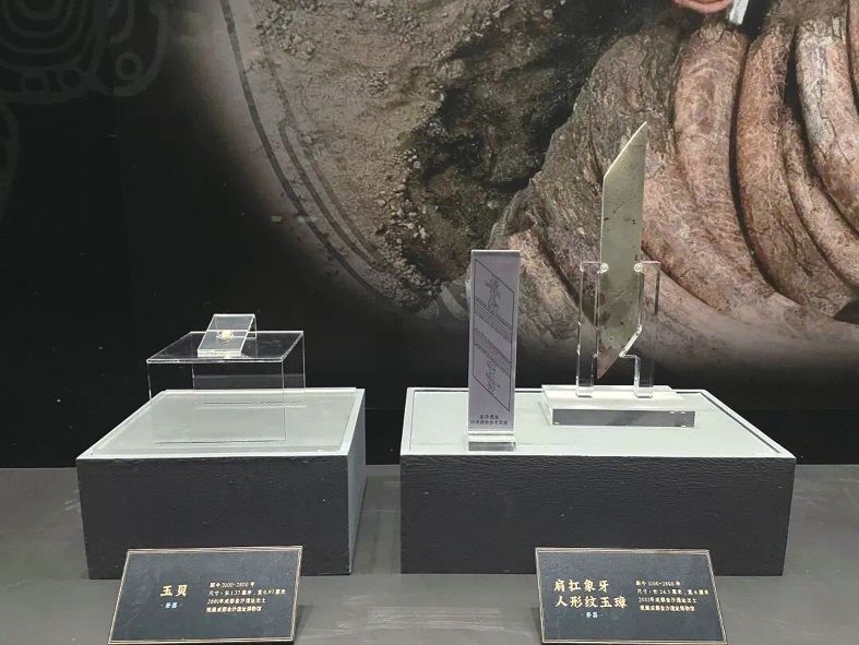 值得注意的是,金沙遗址送展的肩扛象牙人形纹玉璋,两面刻有相同图案,上面的人物头戴高冠、双膝着地,左手持握着一件前尖后宽之物扛在肩上。有学者认为,这一块玉璋反映的是古蜀人扛着象牙进行祭祀活动的场景,这一生动的画面与展厅还原的祭祀场景交相辉映。
