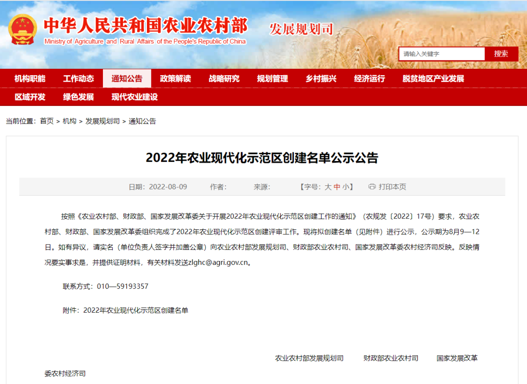 按照《农业农村部、财政部、国家发展改革委关于开展2022年农业现代化示范区创建工作的通知》(农规发〔2022〕17号)要求,农业农村部、财政部、国家发展改革委组织完成了2022年农业现代化示范区创建评审工作。现将拟创建名单(见附件)进行公示,公示期为8月9—12日。如有异议,请实名(单位负责人签字并加盖公章)向农业农村部发展规划司、财政部农业农村司、国家发展改革委农村经济司反映。反映情况要实事求是,并提供证明材料,有关材料发送zlghc@agri.gov.cn。
