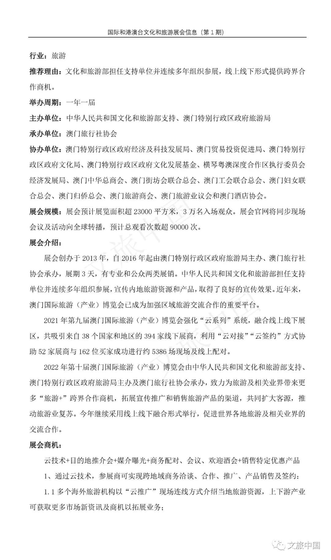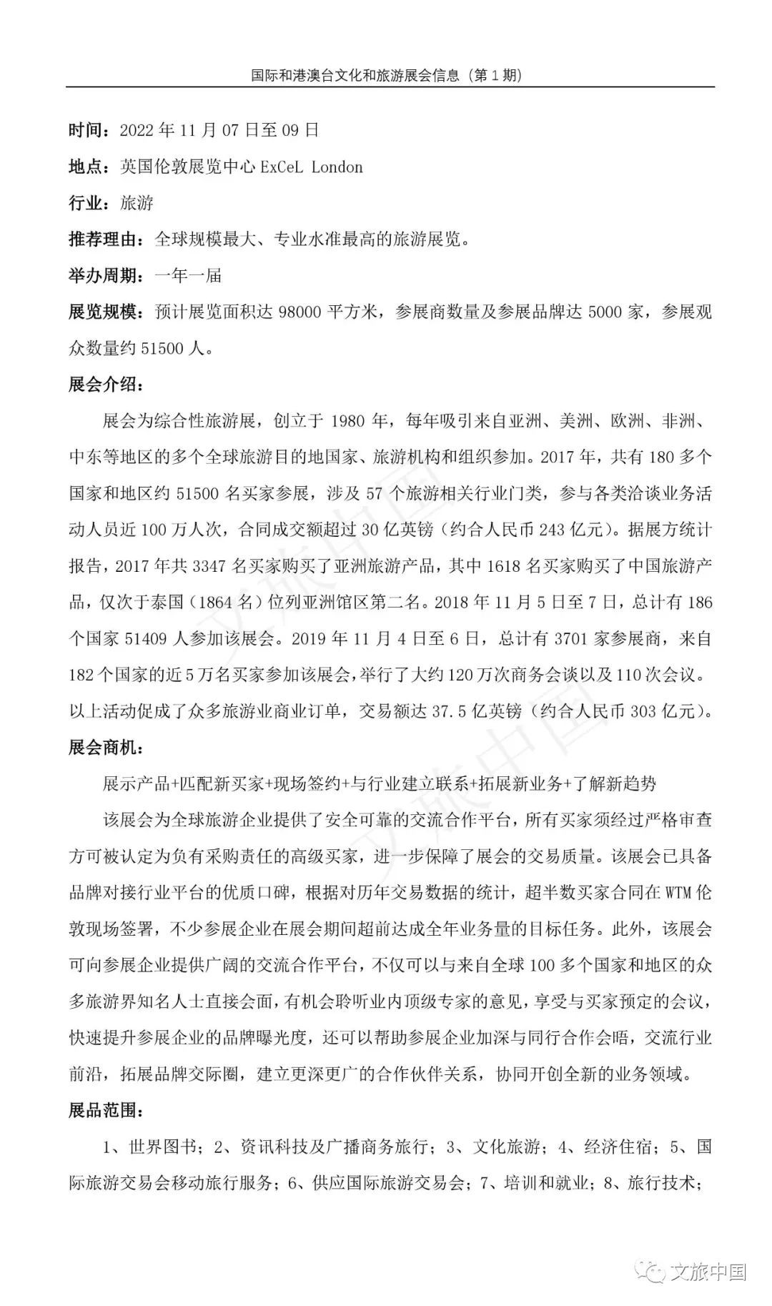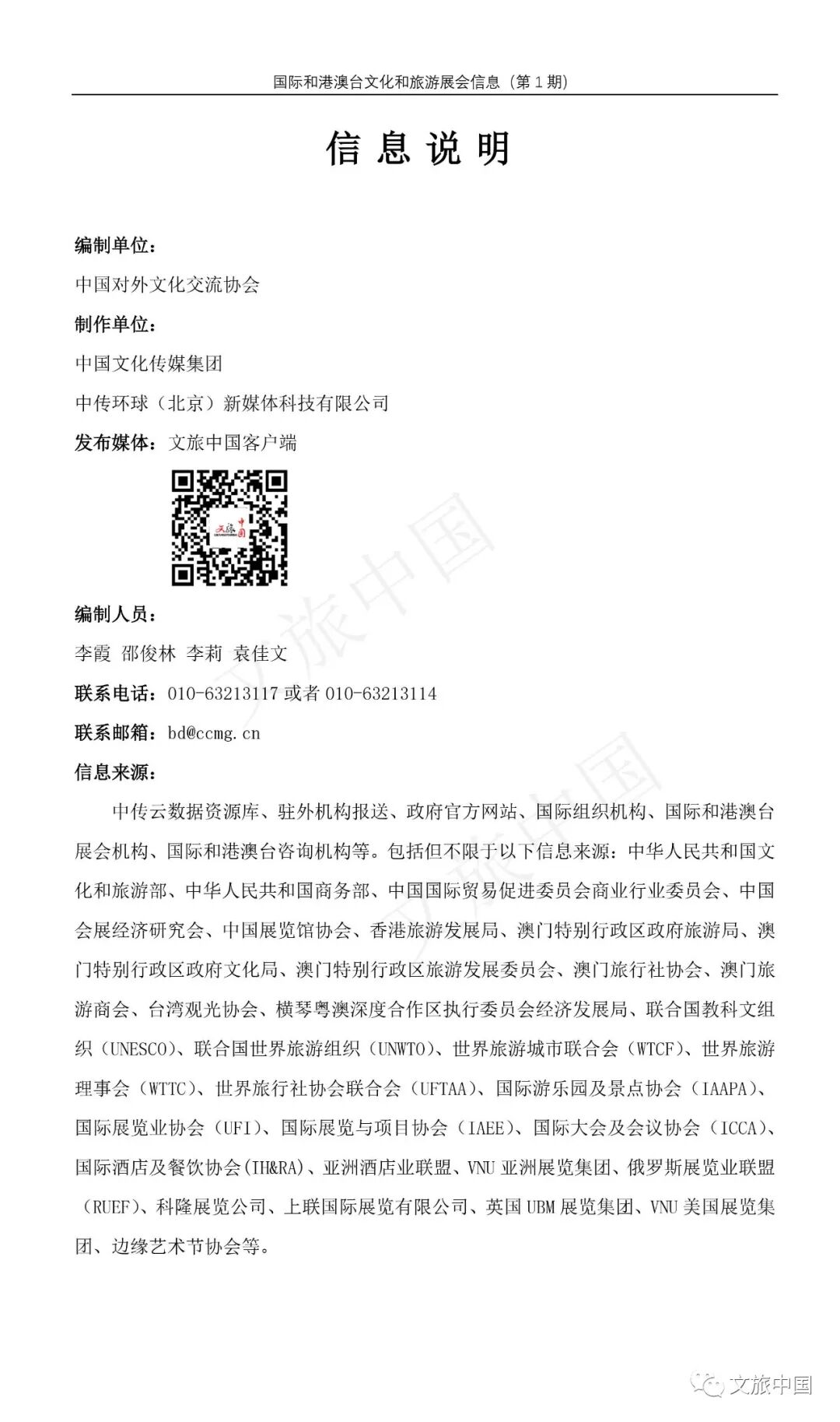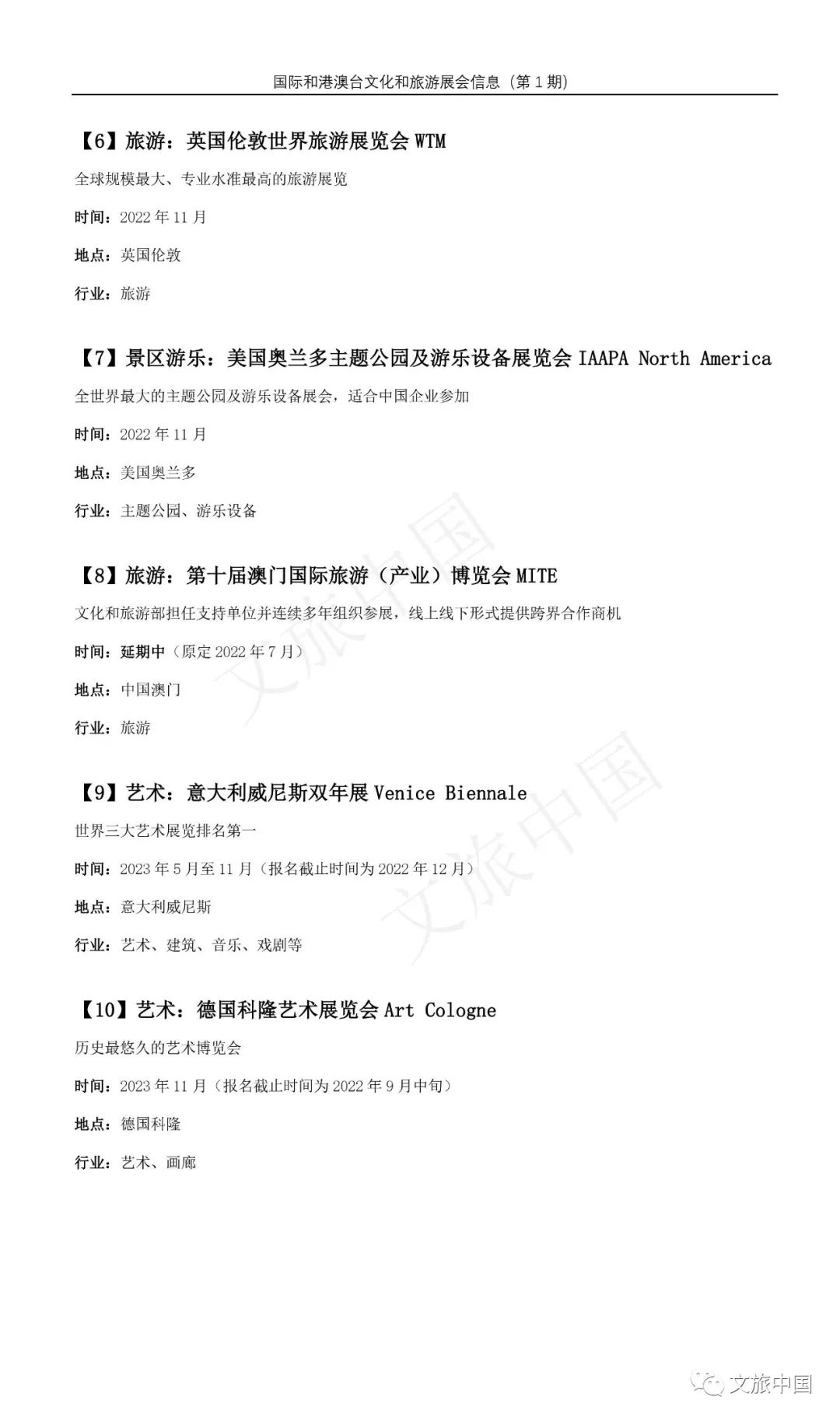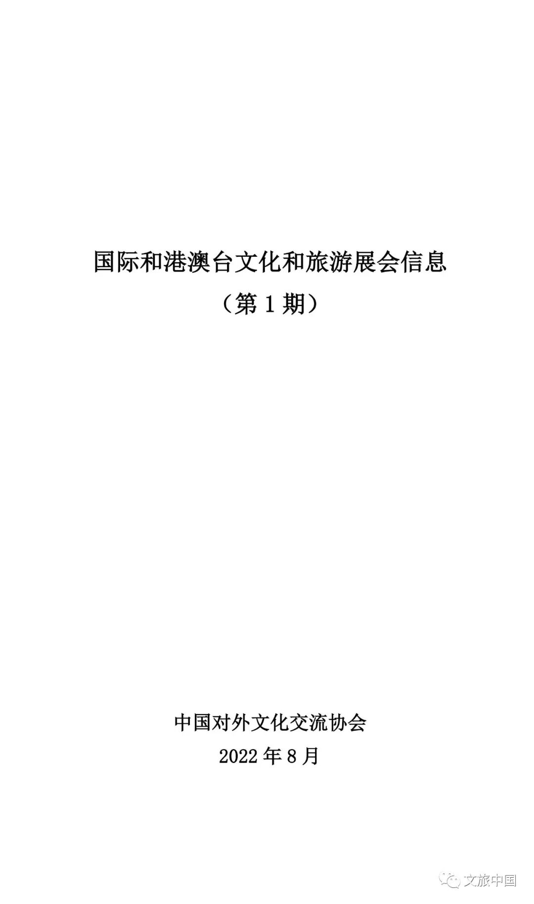 为促进对外和对港澳台的文化和旅游交流与合作,解决国内文化和旅游行业缺乏国际和港澳台行业信息的“急难愁盼”问题,中国对外文化交流协会发布《国际和港澳台文化和旅游展会信息》(以下简称《信息》)。《信息》聚焦重大展会预告信息,定位艺术、演出、旅游、酒店、动漫、音乐、文化遗产、景区游乐、博物馆、图书馆、艺术品、体育运动、品牌授权、展销等不同领域,助力国内文化和旅游“走出去”,后续每季度发布一期。《信息》原文如下: