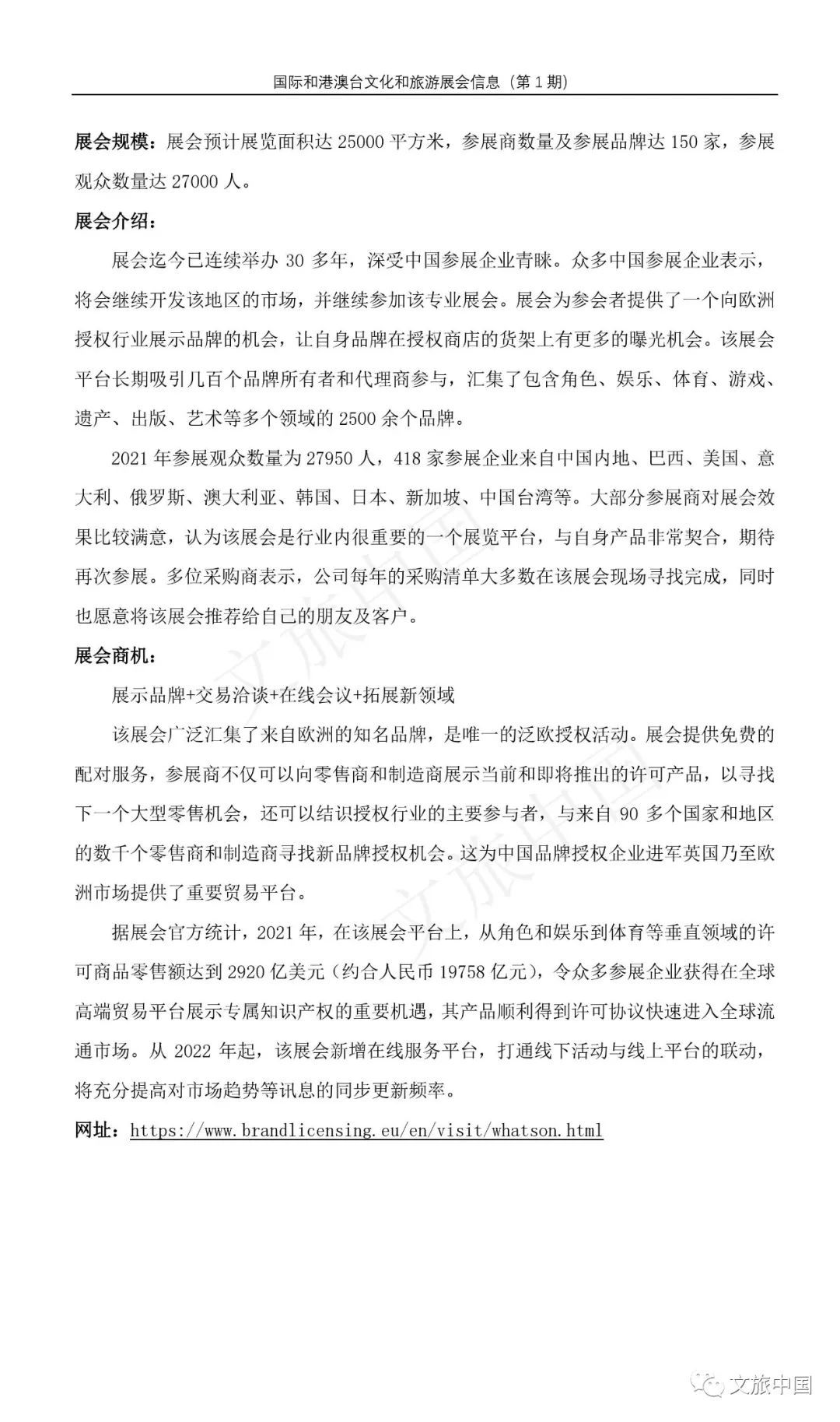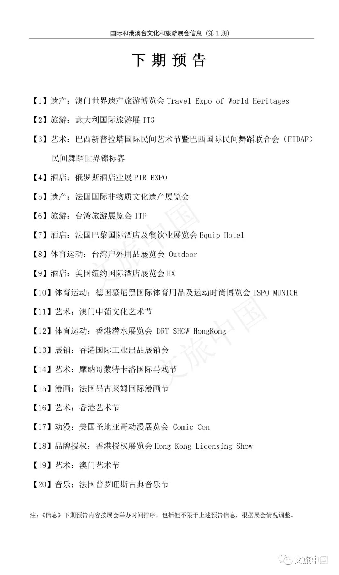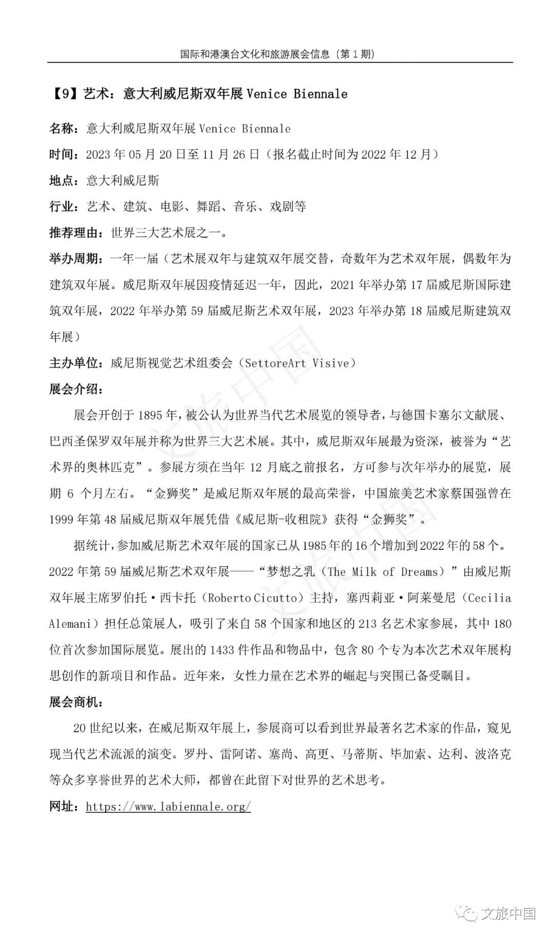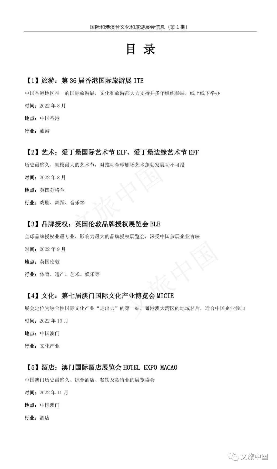 为促进对外和对港澳台的文化和旅游交流与合作,解决国内文化和旅游行业缺乏国际和港澳台行业信息的“急难愁盼”问题,中国对外文化交流协会发布《国际和港澳台文化和旅游展会信息》(以下简称《信息》)。《信息》聚焦重大展会预告信息,定位艺术、演出、旅游、酒店、动漫、音乐、文化遗产、景区游乐、博物馆、图书馆、艺术品、体育运动、品牌授权、展销等不同领域,助力国内文化和旅游“走出去”,后续每季度发布一期。《信息》原文如下: