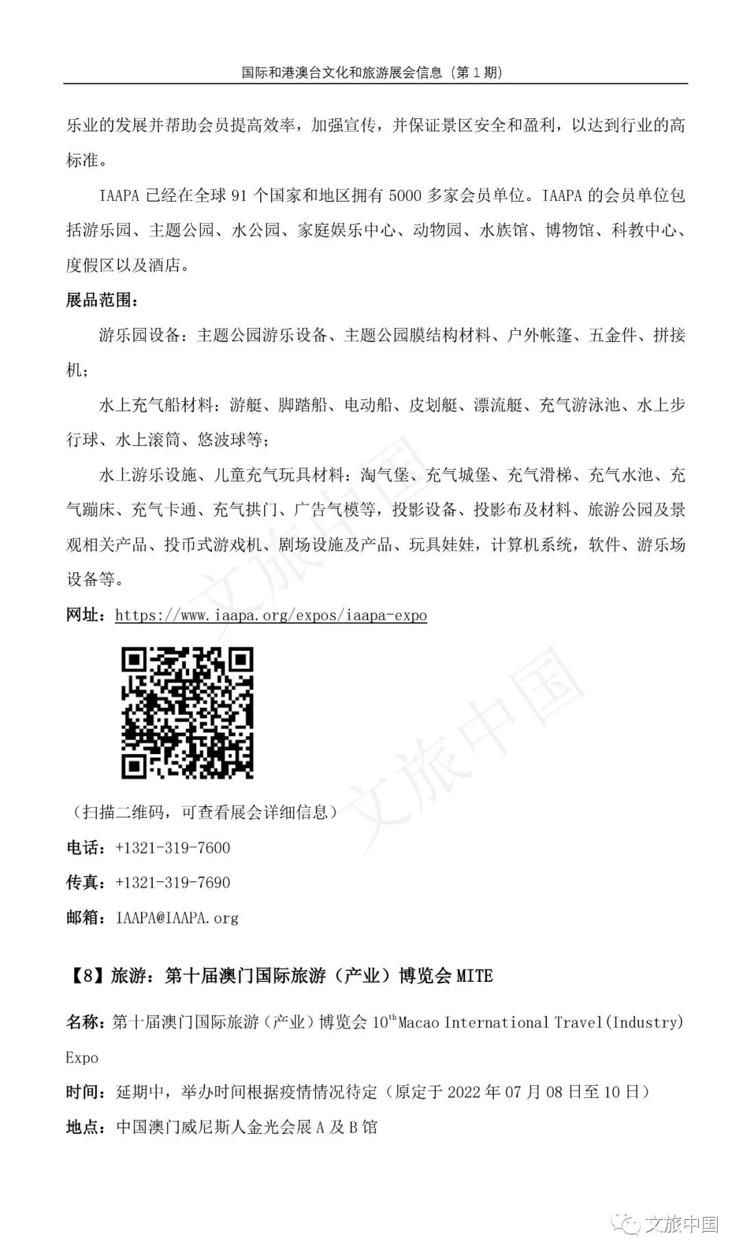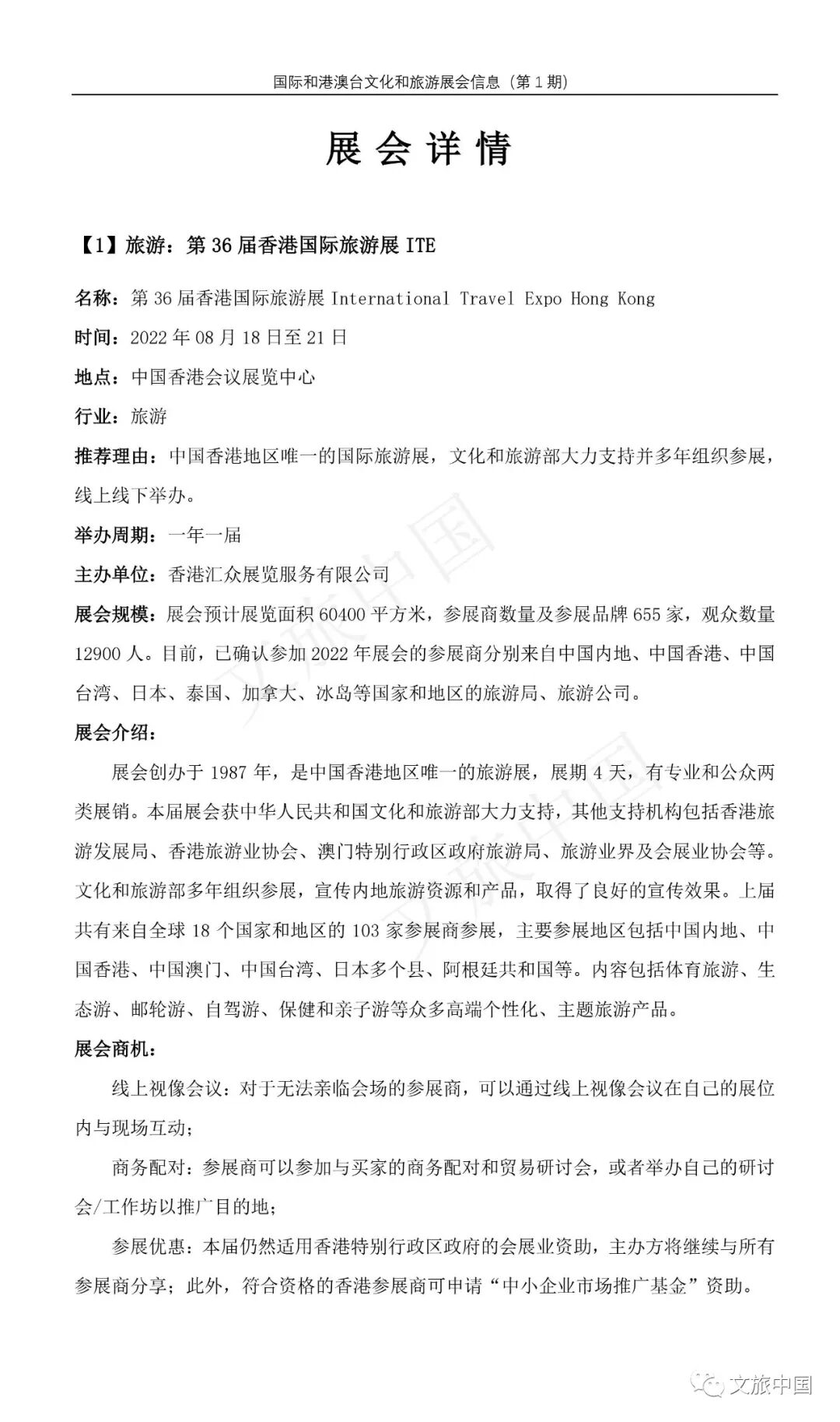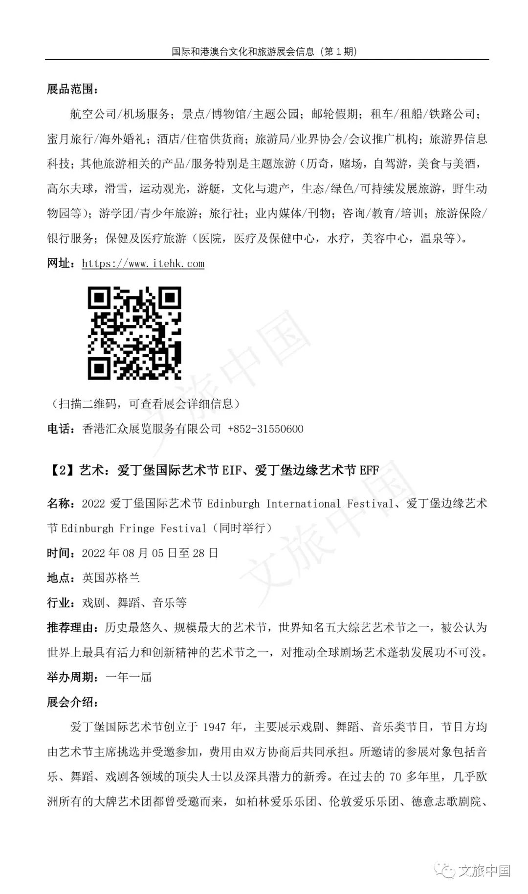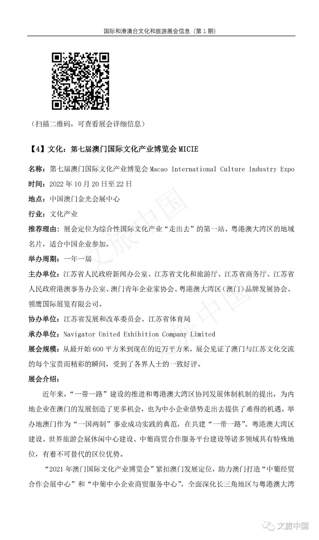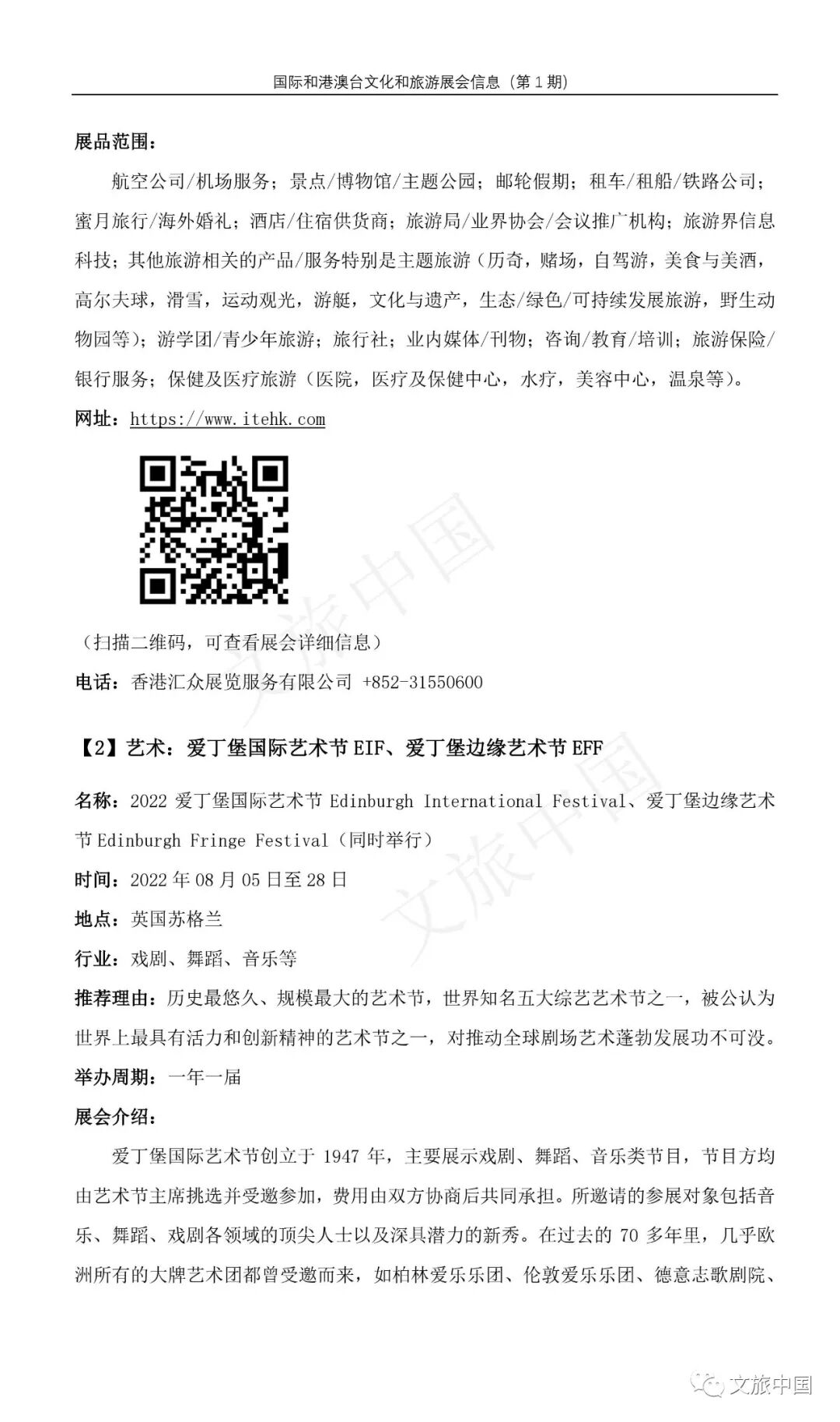 为促进对外和对港澳台的文化和旅游交流与合作,解决国内文化和旅游行业缺乏国际和港澳台行业信息的“急难愁盼”问题,中国对外文化交流协会发布《国际和港澳台文化和旅游展会信息》(以下简称《信息》)。《信息》聚焦重大展会预告信息,定位艺术、演出、旅游、酒店、动漫、音乐、文化遗产、景区游乐、博物馆、图书馆、艺术品、体育运动、品牌授权、展销等不同领域,助力国内文化和旅游“走出去”,后续每季度发布一期。《信息》原文如下: