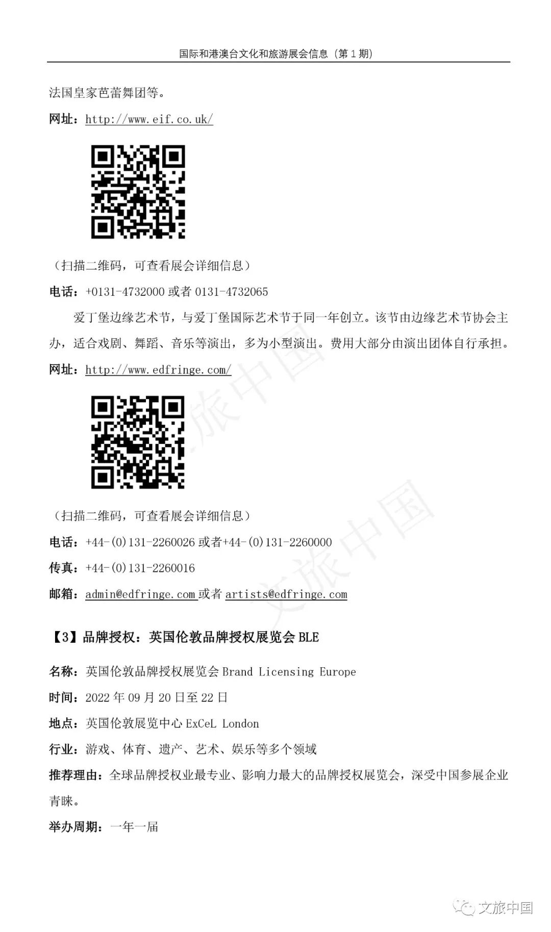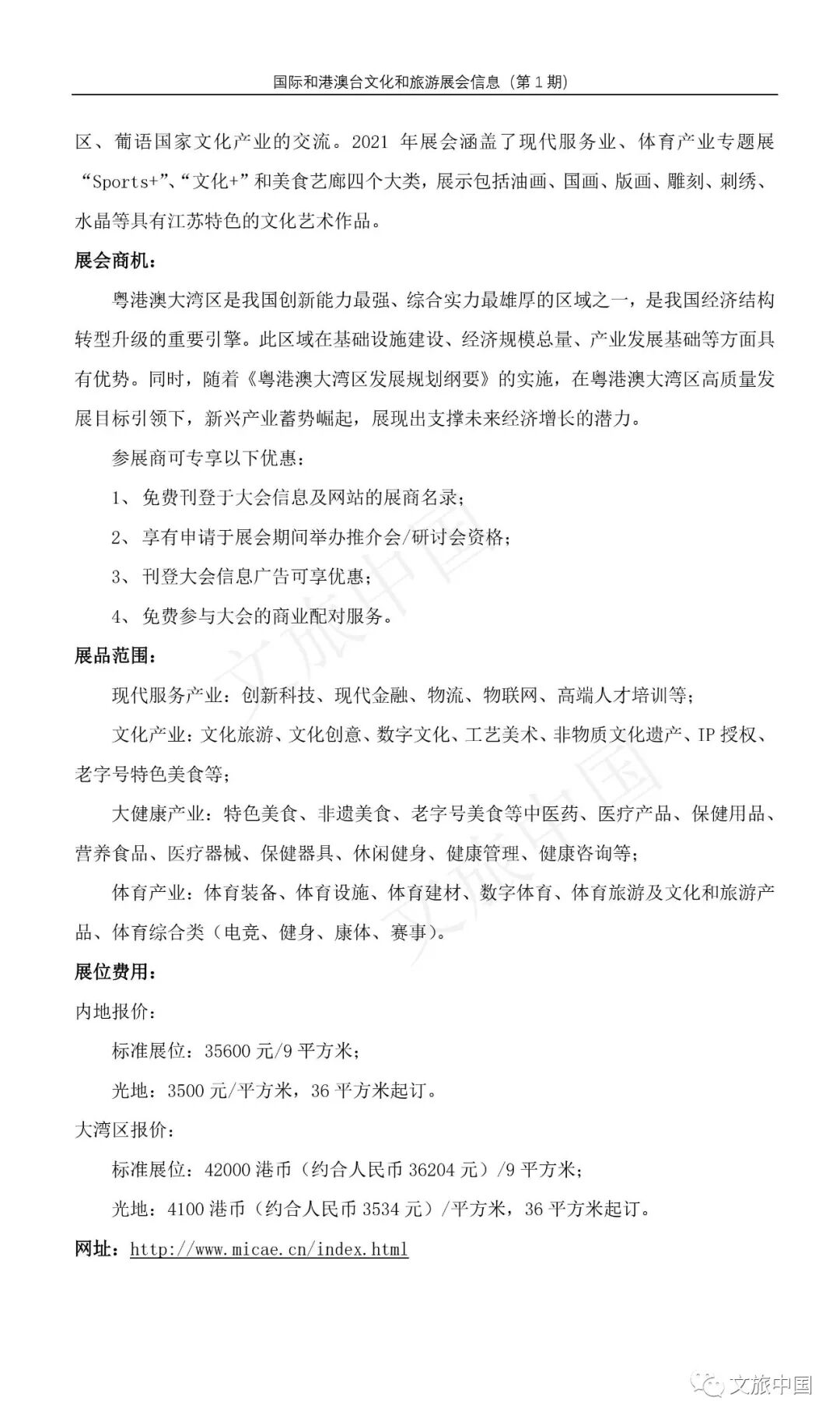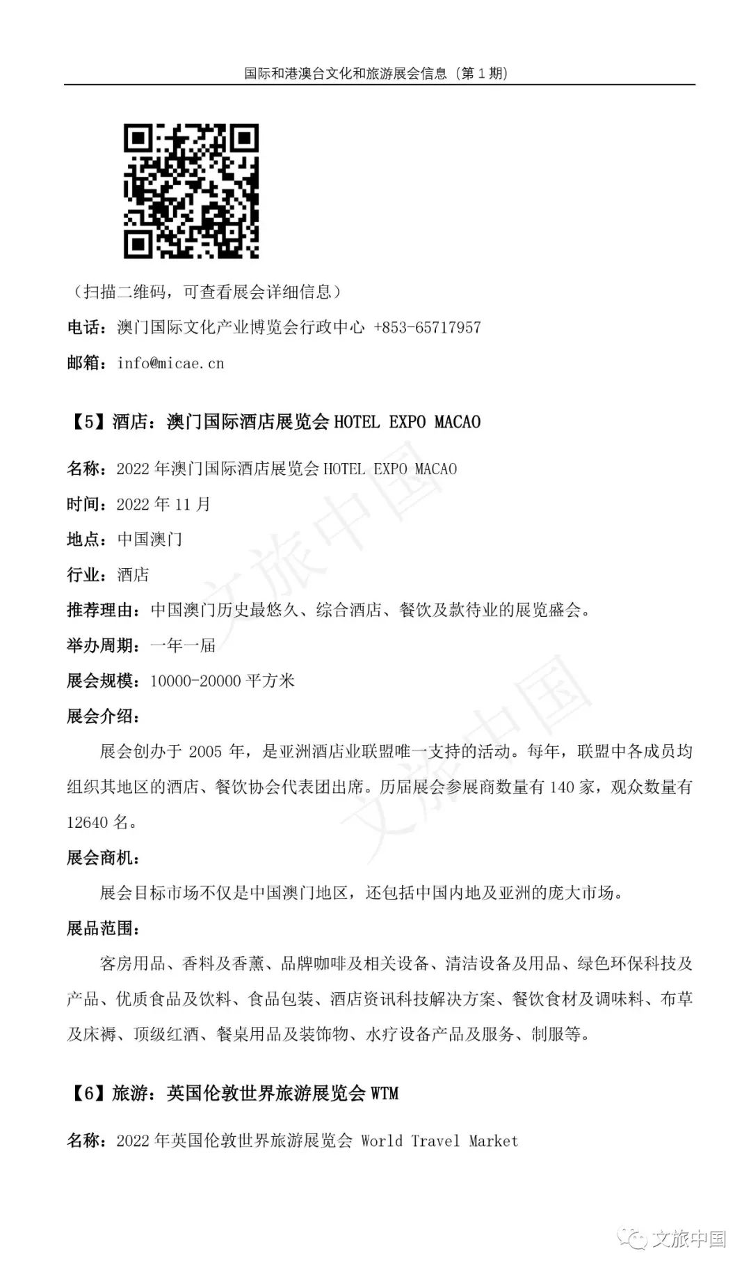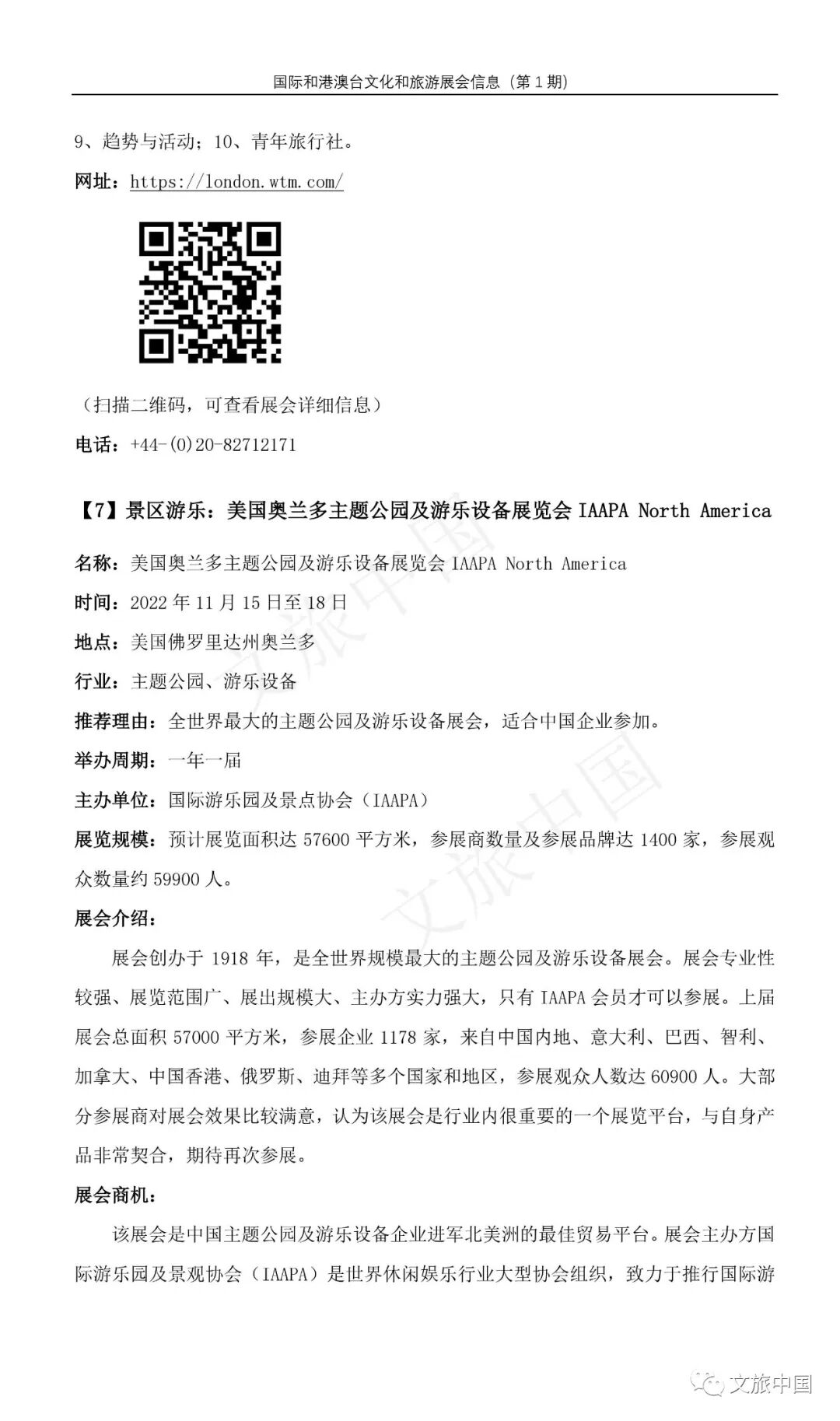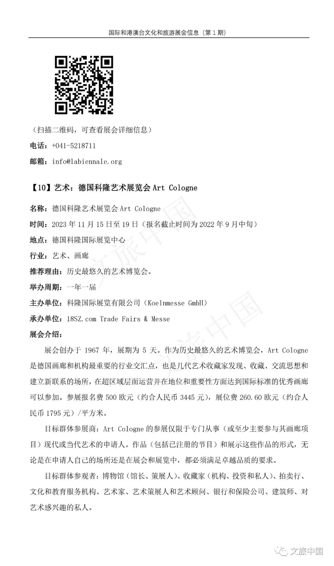 为促进对外和对港澳台的文化和旅游交流与合作,解决国内文化和旅游行业缺乏国际和港澳台行业信息的“急难愁盼”问题,中国对外文化交流协会发布《国际和港澳台文化和旅游展会信息》(以下简称《信息》)。《信息》聚焦重大展会预告信息,定位艺术、演出、旅游、酒店、动漫、音乐、文化遗产、景区游乐、博物馆、图书馆、艺术品、体育运动、品牌授权、展销等不同领域,助力国内文化和旅游“走出去”,后续每季度发布一期。《信息》原文如下: