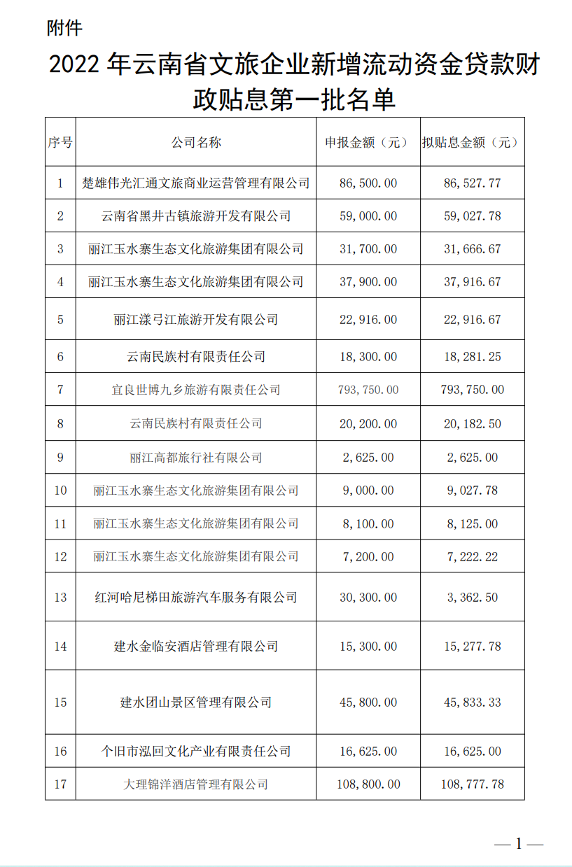 根据《云南省关于文旅行业的纾困帮扶措施》第九条(对文旅企业2022年新增流动资金贷款,按企业实际获得贷款利率的50%予以贴息,贴息利率不高于5%。同一企业同一笔贷款,已享受国家和省级其他贷款贴息政策支持的,不再重复补助),经过企业申报,区县和州市文旅局、财政局逐级审核上报,省级审核,现将通过审核的2022年第一批新增流贷贴息名单予以公示。