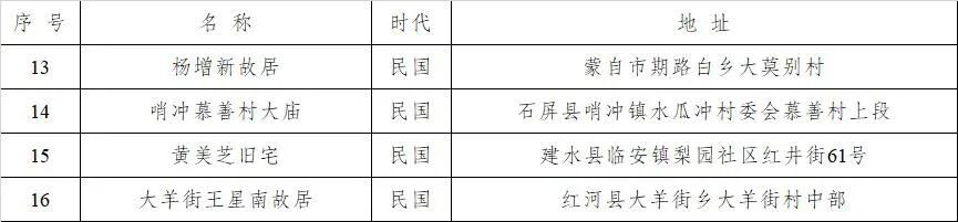 根据国家《文物保护法》的有关规定,红河州文化和旅游局(州文物局)组织开展了第八批红河州州级文物保护单位的申报评审。经过各有关县市人民政府推荐申报、实地查验、专家组评审、州文化和旅游局(文物局)审查复核等程序,最终全州共计16处文物保护单位通过了评审。