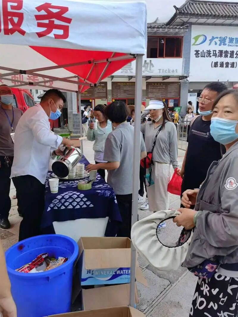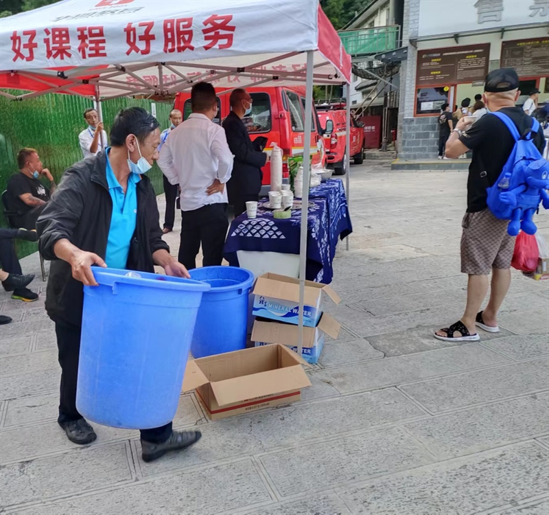 (景区工作人员为游客提供热水)