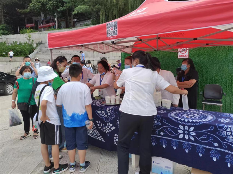 (工作人员给游客送矿泉水)
