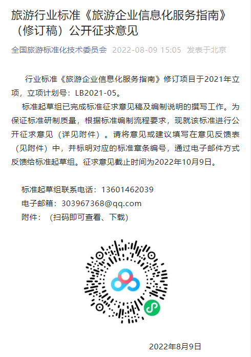 近日,全国旅游标准化技术委员会发布行业标准《旅游企业信息化服务指南》修订稿(以下简称《指南》),公开征求意见。