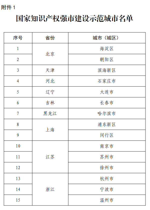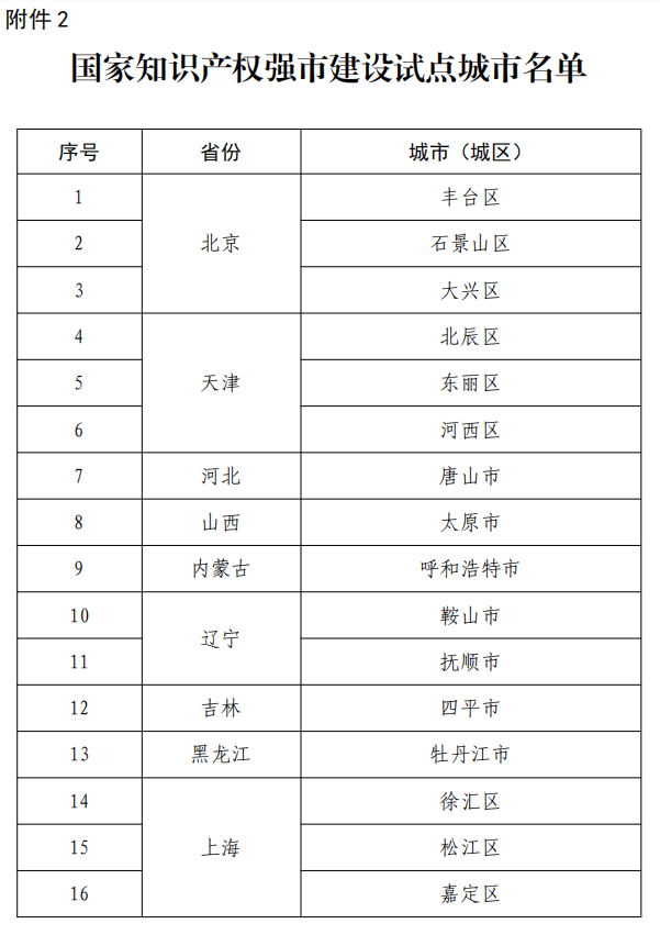 按照《国家知识产权局办公室关于面向城市、县域、园区开展知识产权强国建设试点示范工作的通知》(国知办函运字〔2021〕1197号)要求,经地方申报推荐、材料审查、专家评审等程序,确定北京市海淀区等38个城市(城区)为国家知识产权强市建设示范城市(名单见附件1),北京市丰台区等72个城市(城区)为国家知识产权强市建设试点城市(名单见附件2),试点示范时限自2022年7月至2025年6月。