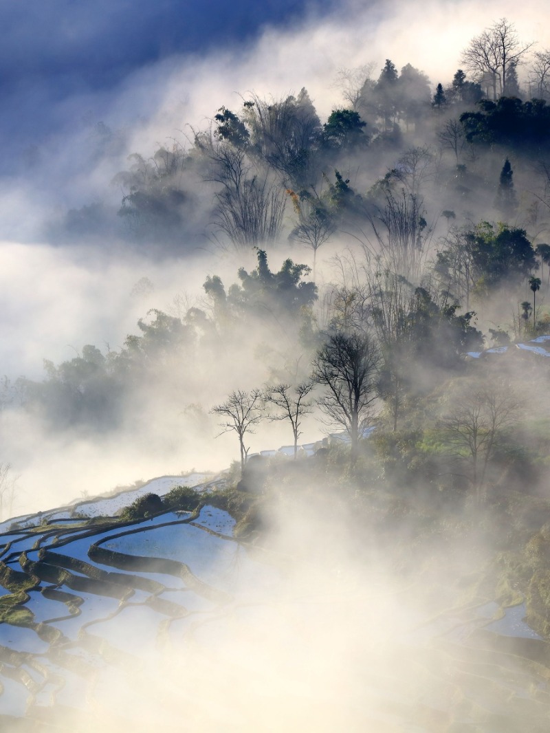 清晨,梯田被一层薄薄的云雾笼罩,曲线若隐若现,朦胧又唯美。