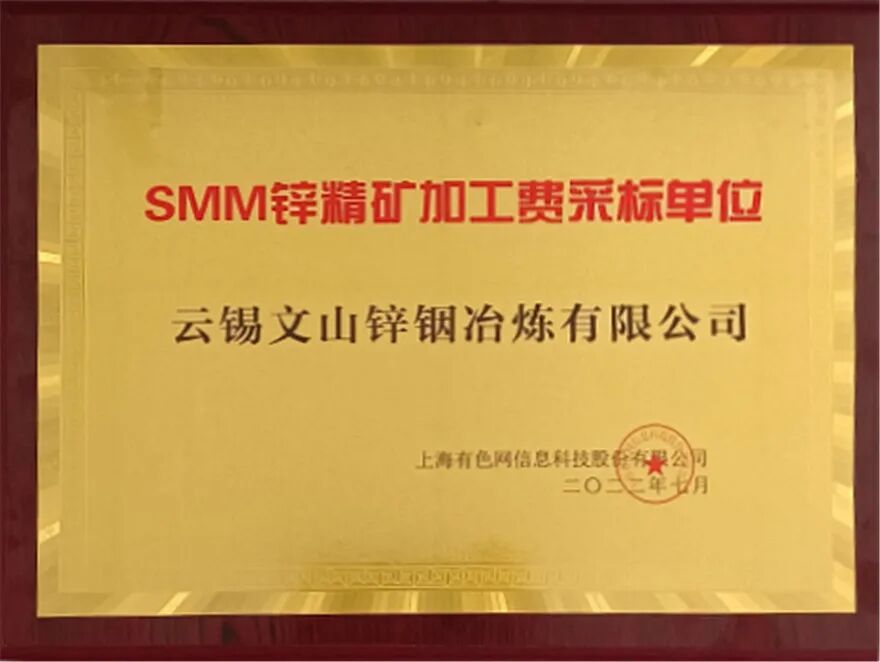 日前,云锡文山锌铟冶炼有限公司被上海有色网(SMM)评为“SMM锌精矿加工费采标单位”。