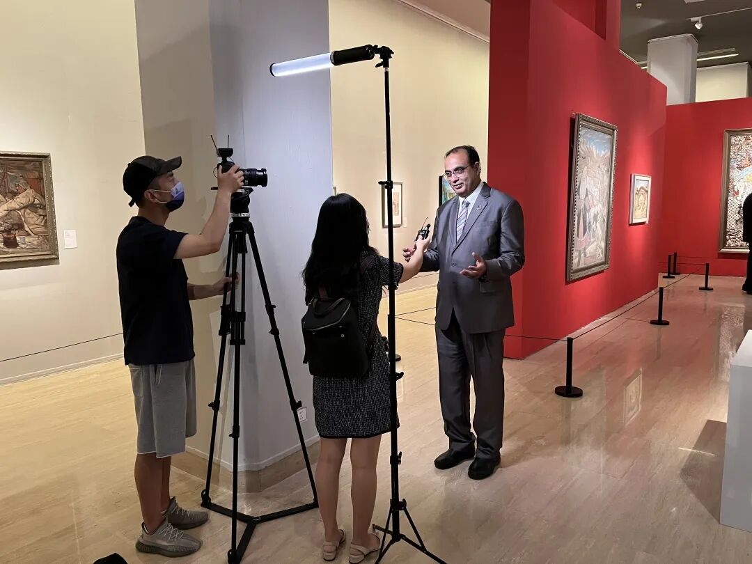 (联合国教科文组织驻华代表夏泽翰在 ”艺汇丝路”艺术展开幕式上接受CGTN记者采访。)
