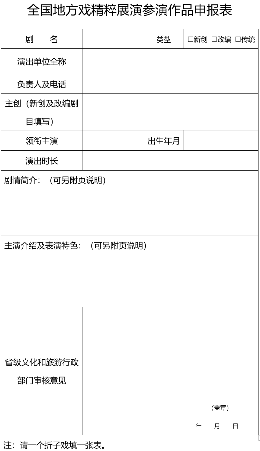 2.《全国地方戏精粹展演参演作品申报表》1份。