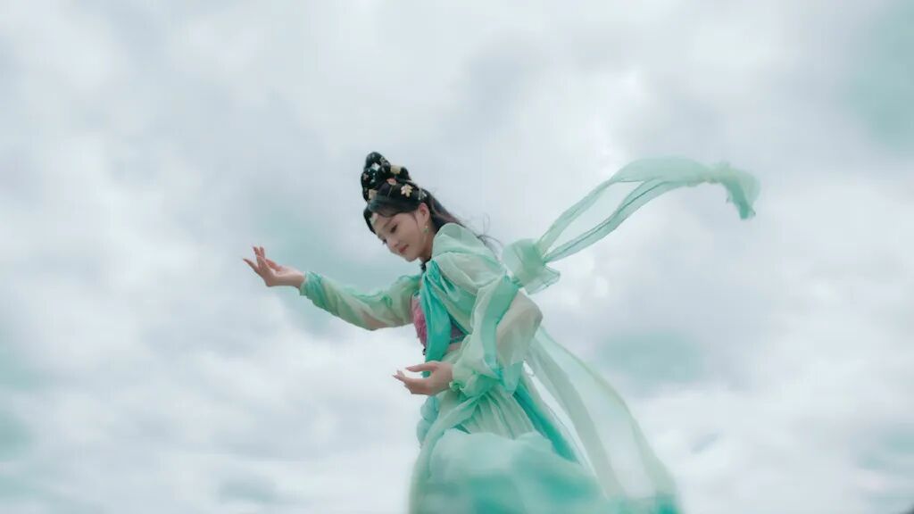 视频中,仙女飞过湖面,青山绿水间,身姿翩跹,指尖灵动,百花齐放,花暖人间。