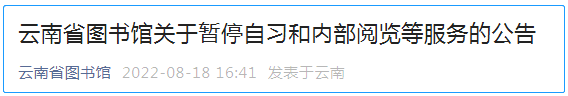 当前,昆明市疫情防控形势十分严峻,由于图书馆属于空间相对封闭、人员密集的公共文化服务场所,按照上级领导部门关于进一步加强疫情防控工作的相关通知要求,为了保障广大读者和人民群众的身体健康与生命安全,我馆从2022年8月19日起,暂停向自习读者开放,同时暂停各个阅览室的内阅服务,仅保留对持有“云南省图书馆读者证”的读者开放图书、期刊借还服务。前来借书或还书的读者请勿在馆内逗留,即借即走、即还即走。此外,近期我馆不再举办线下读者活动,云南典籍博物馆、云南省图书馆古籍修复保护传拓研习馆、展厅、报告厅、多功能厅、视障阅览室暂停对外开放。