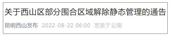 8月17日,根据西山区应对新型冠状病毒肺炎疫情工作领导小组指挥部统一安排,在西山区部分区域围合开展核酸筛查。经综合评估研判,自2022年8月22日06时起,根据风险等级分批次解除静态管理。密接的居住地(单元、楼栋等)严格执行7天7检,经研判方可解除静态管理。次密接的居住地(单元、楼栋等)严格执行7天3检,经研判方可解除静态管理。其他区域,持有静态管理以来近三天的3次核酸检测阴性结果可以解除静态管理,并恢复常态化疫情防控。现对划定的以下3个区域解除静态管理: