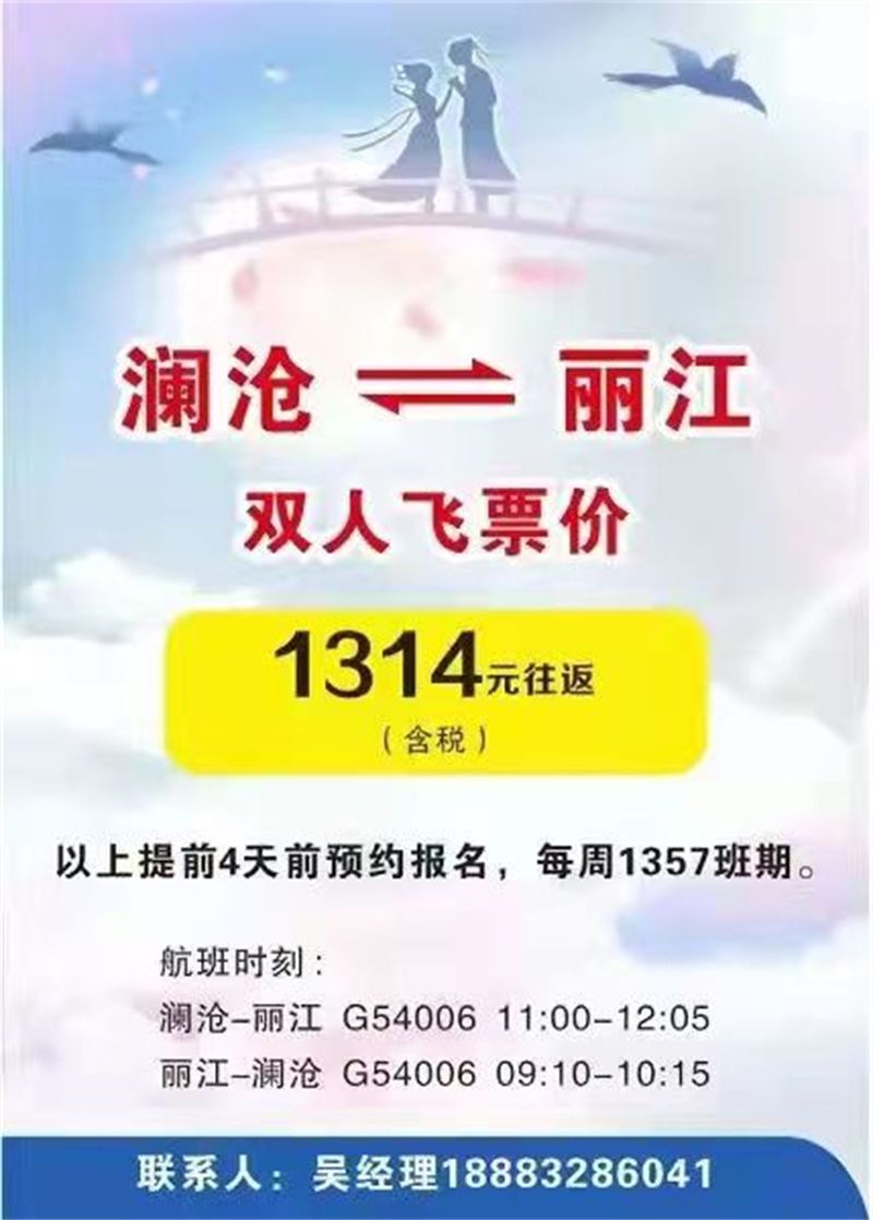 澜沧⇌丽江双人飞票价1314元往返(含税)