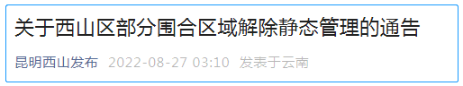 8月17日,根据西山区应对新型冠状病毒感染肺炎疫情工作领导小组指挥部统一安排,在西山区部分区域围合开展核酸筛查。经综合评估研判,自2022年8月27日03时起,对划定的以下2个区域解除静态管理:
