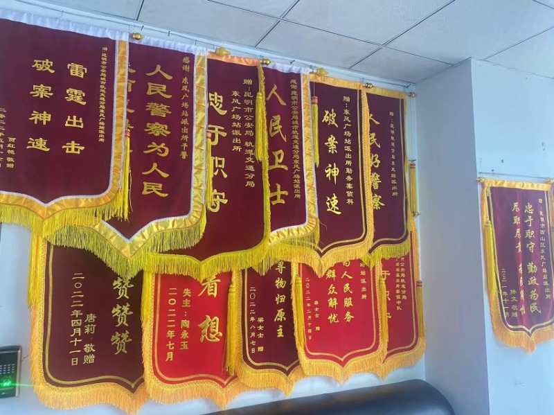 仅今年以来,派出所充分利用地铁监控视频和公安机关办案的手段、方法,累计为41名乘客找回遗忘在地铁区域内的手机、笔记本电脑、箱包等财物41件,挽回经济损失共计17余万元。这些为民服务的工作得到了人民群众的好评和相关部门的充分肯定,收到锦旗10面、感谢信5封,被云南广播电视台宣传报道2次,“轨道公安”微博发布派出所为民工作信息13条。