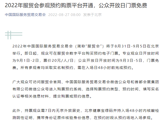 2022年中国国际服务贸易交易会(简称“服贸会”)将于8月31日-9月5日在北京举行。即日起,观众可在服贸会数字平台购买预约电子门票。专业观众日开放时间为9月1日-2日,票价20元/人/日;公众开放日开放时间为9月3日-5日,门票免费。所有参观者均采取实名制预约,需在入场日48小时前完成预约。