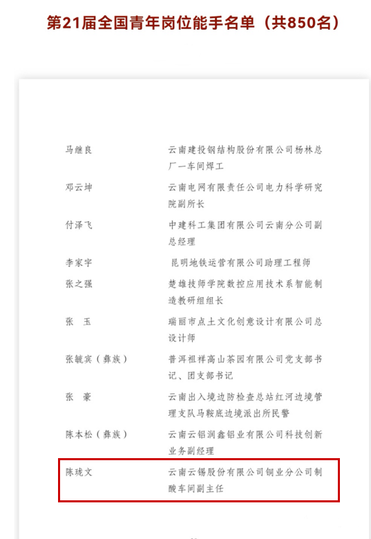 近日,共青团中央发布了第21届全国青年岗位能手(标兵)入围人选公示名单,云锡铜业分公司青年陈珑文入围。