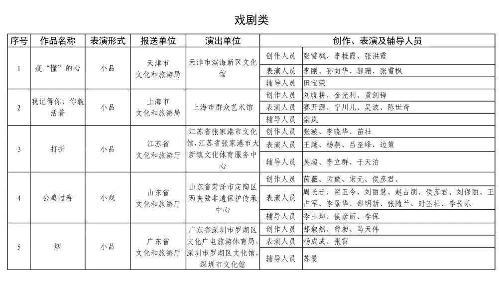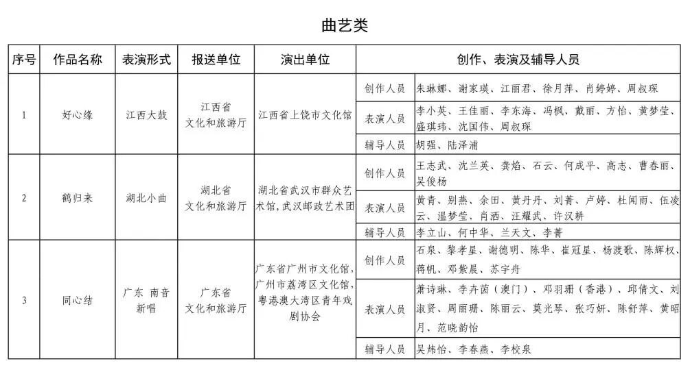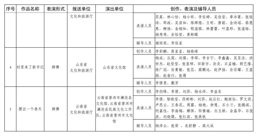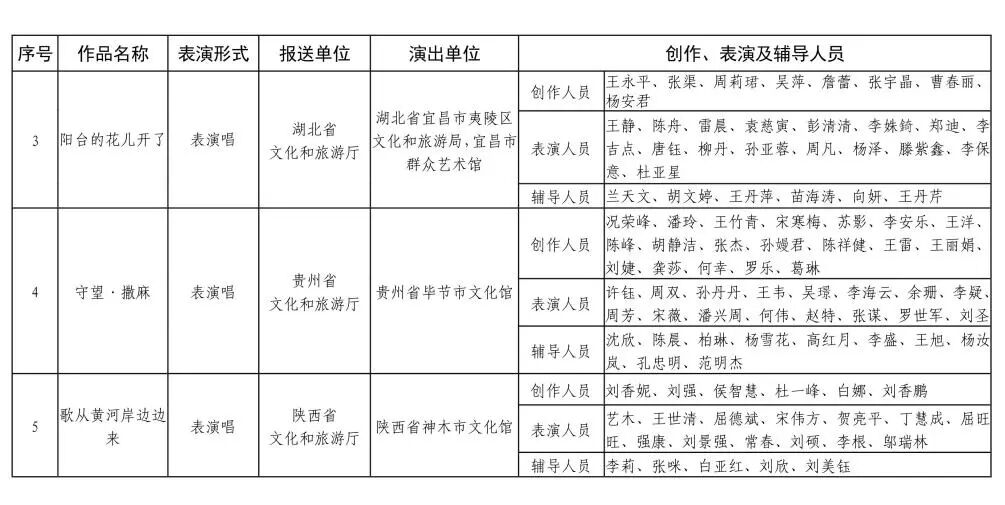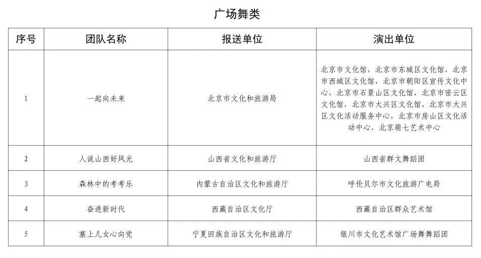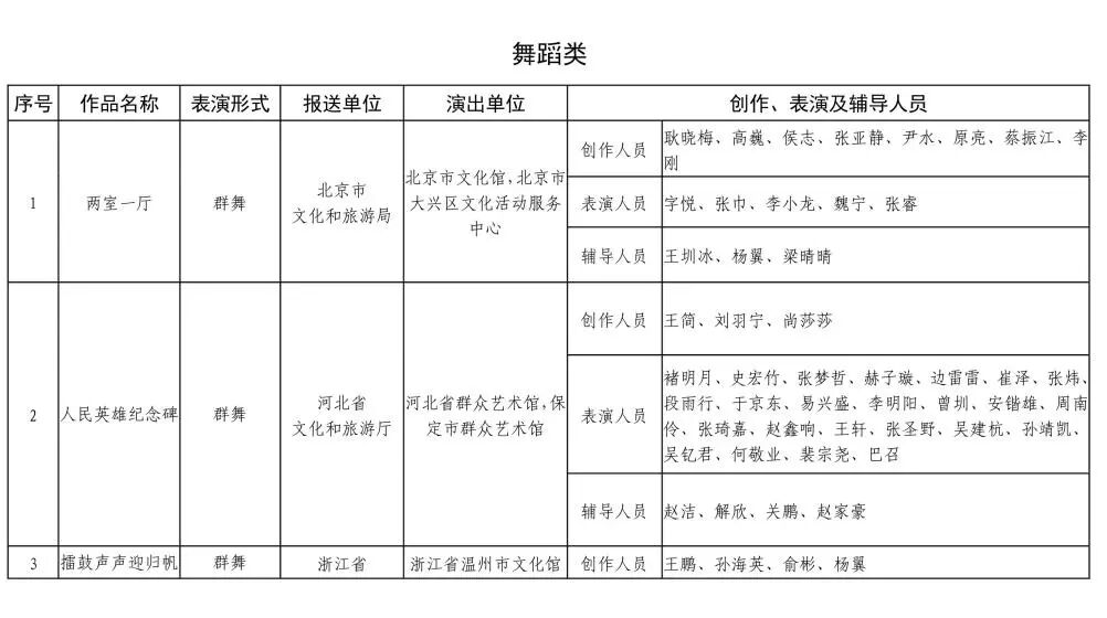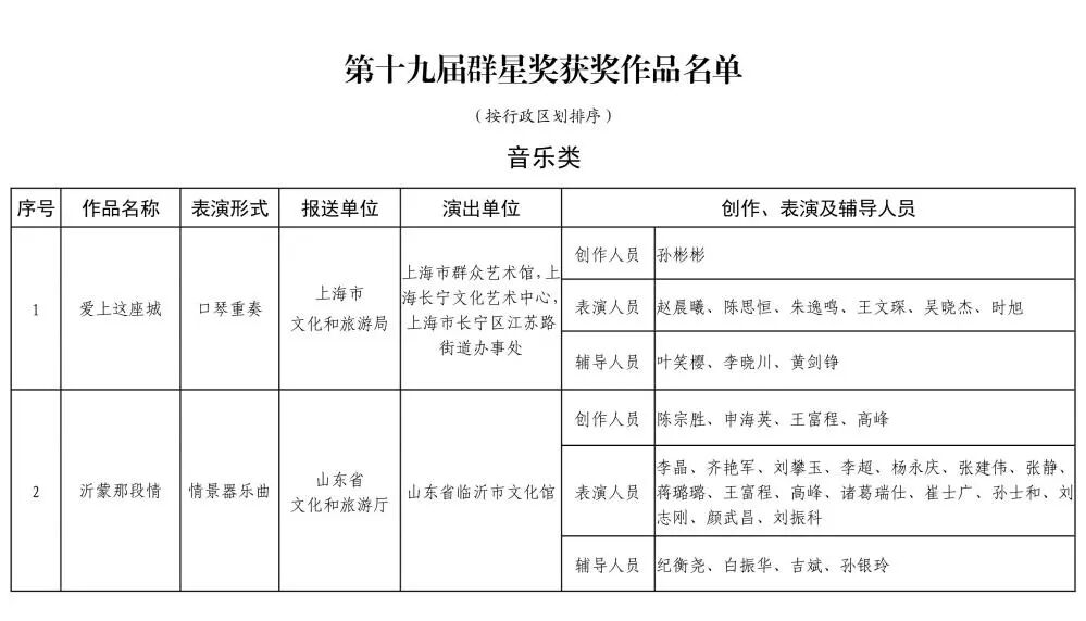 根据《文化和旅游部办公厅关于开展第十九届群星奖评奖工作的通知》(办公共发〔2022〕61号),文化和旅游部组织了第十九届群星奖决赛。经评审,形成了第十九届群星奖音乐、舞蹈、戏剧、曲艺、广场舞、群众合唱团队等六个门类的获奖名单。