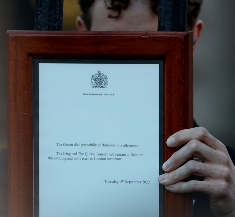 ↑9月8日,在英国伦敦,工作人员将英国女王伊丽莎白二世去世的告示安放在白金汉宫大门上。新华社记者李颖摄
