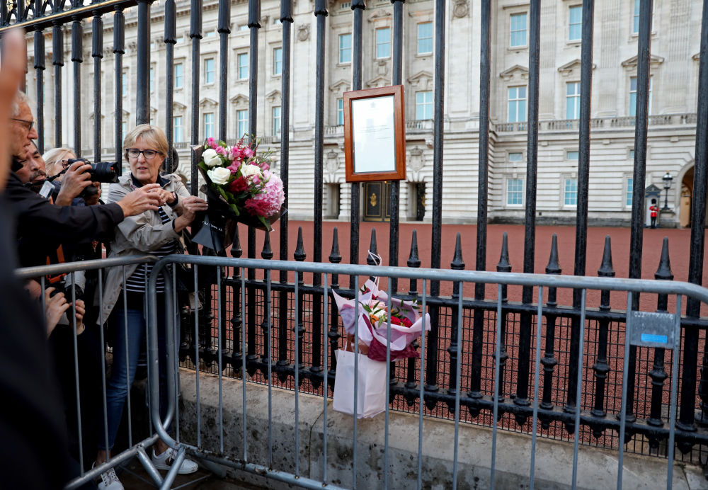 ↑9月8日,一名女子在英国伦敦的白金汉宫门前献花。新华社记者李颖摄