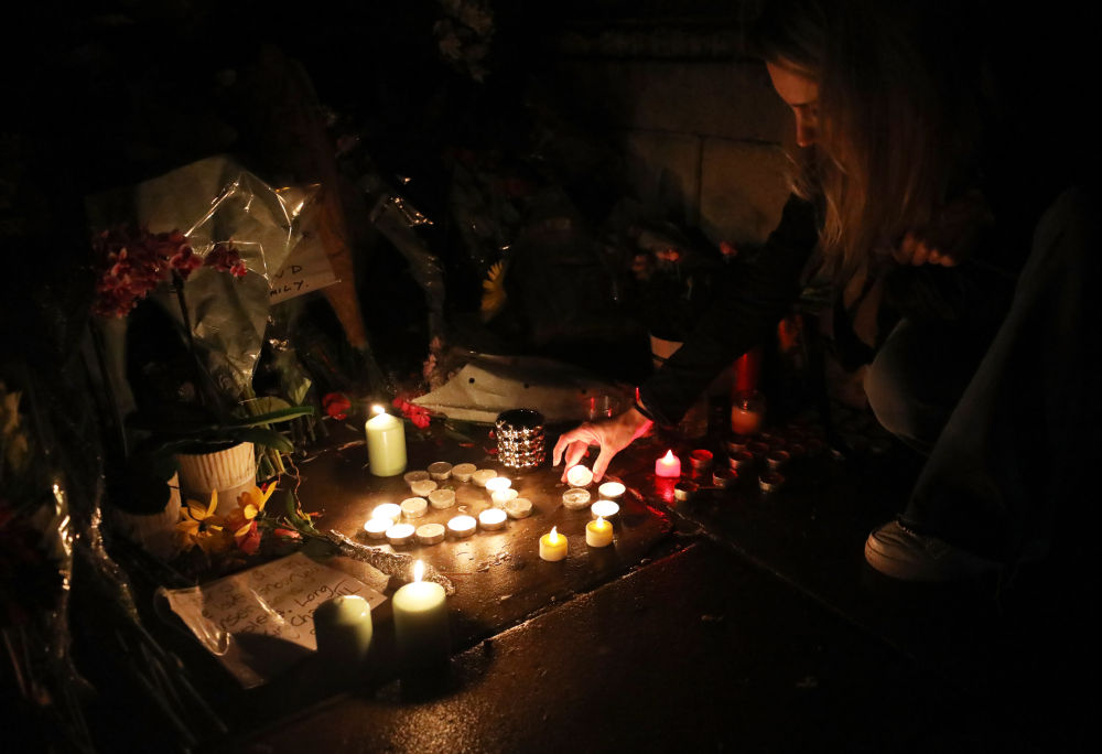 ↑9月8日,一名女子在英国伦敦的白金汉宫外点燃蜡烛。新华社记者李颖摄