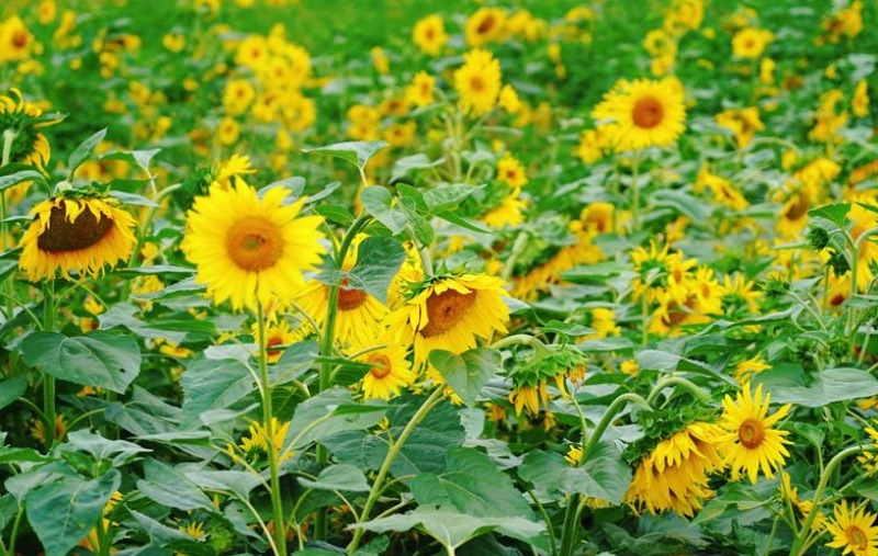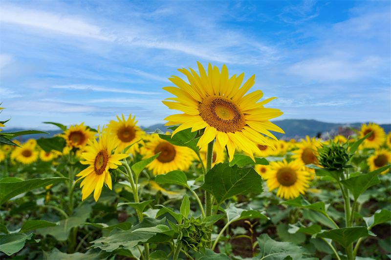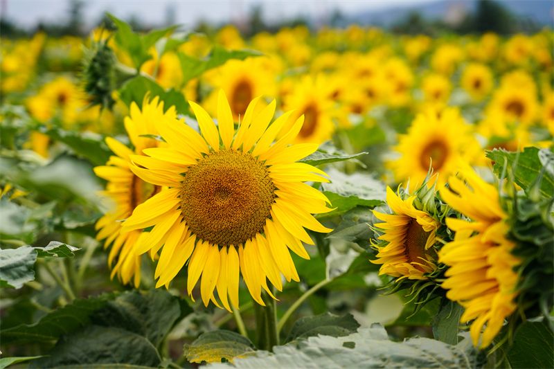 百亩向日葵花,在绿叶的映衬下璀璨夺目,以最美的花容与姿态,迎接着四方宾客来此驻足观赏。