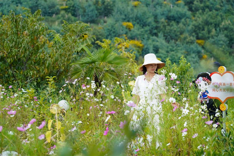果园内,大片格桑花竞相绽放,红的、白的、紫的,姹紫嫣红,点缀在青山之间,美丽极了。