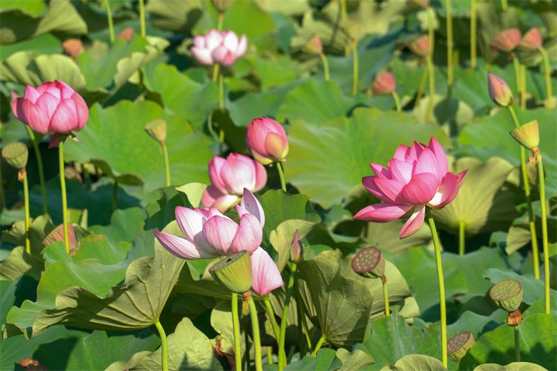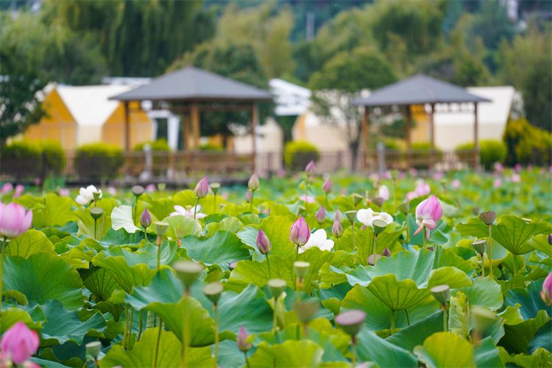 荷塘内建有观赏栈道、观赏亭,漫步其间,看碧绿的荷叶挨挨挤挤,星星点点的荷花嫣然摇动,在绿叶的陪衬下,如落入凡尘的仙子,美得不可方物。空气中飘着淡淡的荷花幽香,让人忍不住轻嗅。