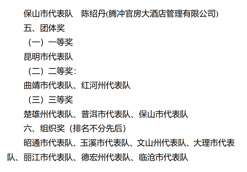2022年8月31日—9月2日,由云南省文化和旅游厅、云南省总工会、共青团云南省委、云南省妇女联合会主办,云南省旅游饭店行业协会协办的“2022年云南省星级饭店从业人员服务技能竞赛总决赛”在昆明举行。本次竞赛设置了前厅服务、客房服务、中餐服务、西餐服务四个项目,分别评选出一等奖1名、二等奖2名、三等奖3名;团体一等奖1名、二等奖2名、三等奖3名;组织奖7名。现将获奖名单(见附件)予以公告。