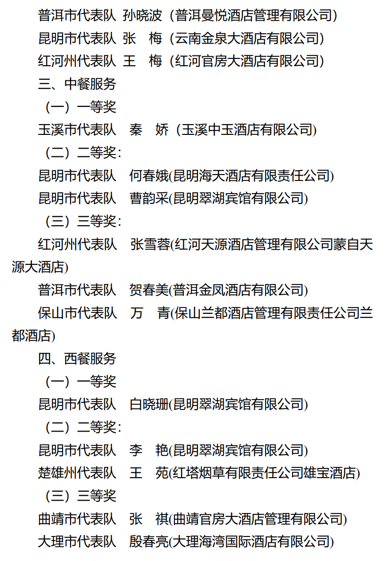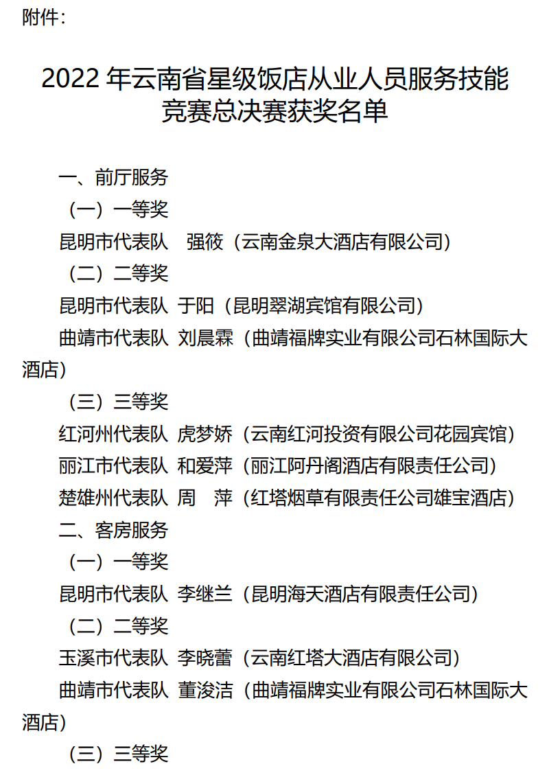 云南省文化和旅游厅关于2022年云南省星级饭店从业人员服务技能竞赛总决赛获奖名单的公告