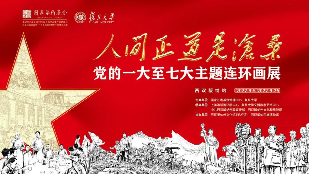 为深入巩固党史学习教育成果,喜迎党的二十大胜利召开,由国家艺术基金管理中心和复旦大学主办,上海海派连环画中心、复旦大学文博数字艺术中心、西双版纳州委宣传部、州文化和旅游局承办的“人间正道是沧桑——党的一大至七大主题连环画展(西双版纳站)”于2022年9月5日—25日在西双版纳州美术馆展出。