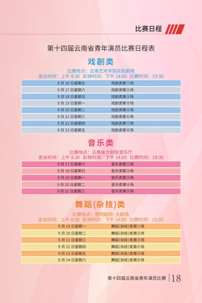 本届比赛分戏剧类、舞蹈(杂技)类、音乐类三个组别,共有19场比赛;其中,戏剧类8场比赛于9月16日至23日在云南艺术学院实验剧场举行,舞蹈(杂技)类6场比赛于9月19日至24日在昆明剧院大剧场举行,音乐类5场比赛于9月17日至21日在云南省大剧院音乐厅举行。参赛选手表演的节目丰富多彩,戏剧类有话剧、京剧、滇剧、花灯、白剧、傣剧等多个剧种;舞蹈(杂技)类有单人舞、双人舞、杂技等;音乐类有民族、通俗和美声等演唱及中西器乐演奏等,涵盖了我省现有专业舞台艺术表演形式。