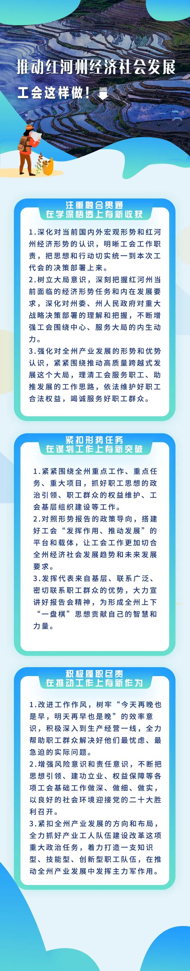 报告对全体代表提出的三点希望,为各级工会组织和职工群众奋进新时代、展现新作为、再建新功绩指明了方向,对全州工会干部和广大职工的鼓舞和鞭策。下一步,全州各级工会组织将充分发挥工人阶级主力军作用,把广大劳动者的积极性创造性调动起来,团结带领全州广大职工群众拼搏奋斗,为推动红河高质量跨越式发展贡献工会力量。