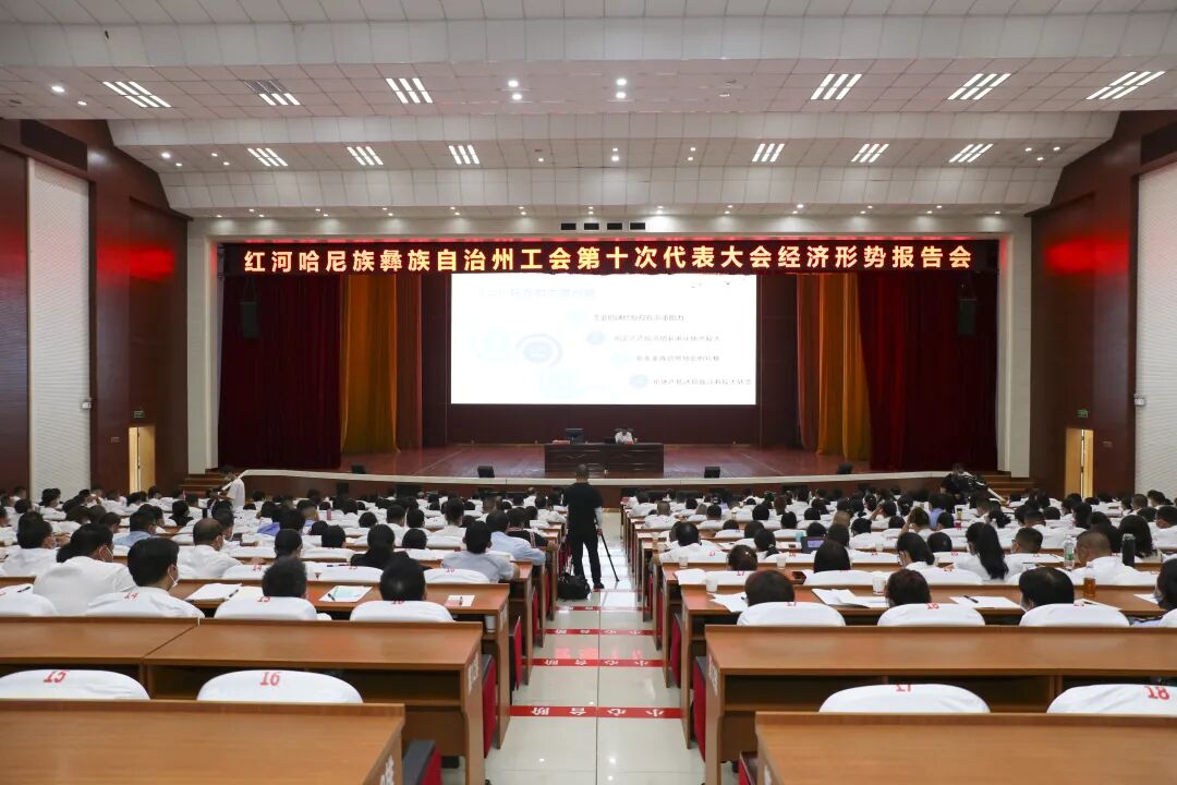 9月19日下午,红河州工会第十次代表大会召开经济形势报告会。州委常委、常务副州长吴世雄出席并作报告,州政协副主席、州总工会主席张艳梅主持报告会。