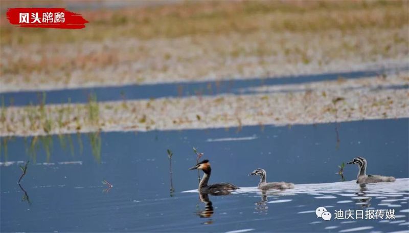 (9月17日,一只凤头䴙䴘“妈妈”带头两只“宝宝”在水中畅游)
