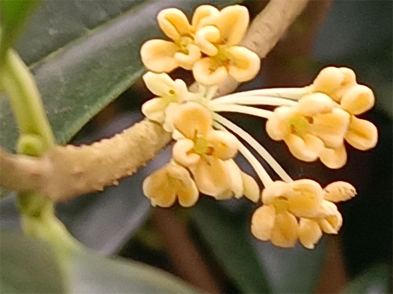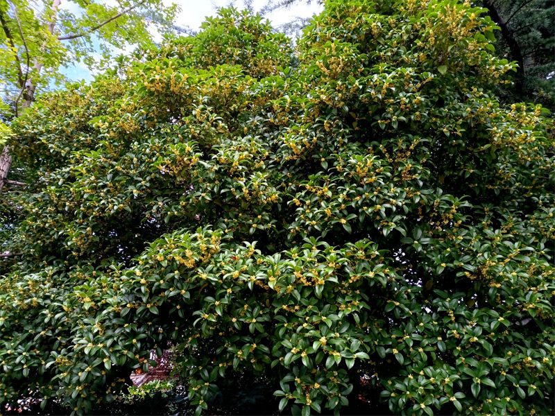 桂花树,树冠往往呈伞形,片片油润的绿叶间,密密匝匝的米粒大小的小黄花挤挤挨挨,纷纷探出头来。你若细看,便会发现,桂花不仅香气冠群,长得也很好看——或乳白或黄或橙红的四叶小花,花型精致、花瓣柔软而饱满,微小却不失精美,显得娇小玲珑、清秀雅致、珊珊可爱。当这些小花攒簇成枝,满眼便是明亮的芳华。