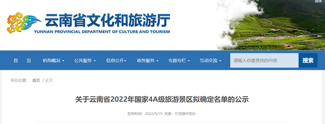 根据《旅游景区质量等级的划分与评定》(GB/T 17775-2003)国家标准和《旅游景区质量等级管理办法》要求,经各州(市)文化和旅游局初评、推荐,省文化和旅游厅按程序认真组织开展了2022年国家4A级旅游景区评定工作,昆明玉龙湾景区等29家景区达到国家4A级旅游景区的标准,拟确定为云南省2022年国家4A级旅游景区。
