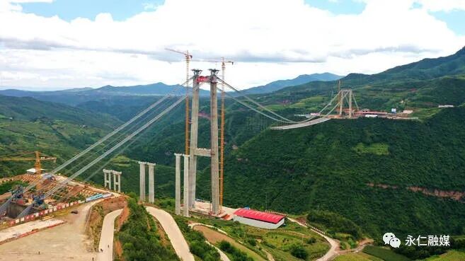 永仁大桥位于永仁县和大姚县交界,跨越江底河峡谷,大桥全长1668米,主跨920米的双塔单跨重力式锚碇钢箱梁悬索桥,主塔高192.7米,桥面距江底河峡谷谷底约360米。是云南省在建第一大同类型桥梁,建成后将是云南省第三大同类桥梁,也将是楚雄州重要的地标性建筑。由于所在区域自然环境复杂,峡谷风力大,雨季周期长,给施工带来了不少困难。中铁大桥局八公司项目部充分发扬“山区建桥铁军”精神,制定了专项吊装方案,创造性改良施工工艺,采取24小时作业,有效提高钢箱梁吊装过程中的安全性和作业效率,确保全面完成今年年度生产目标。