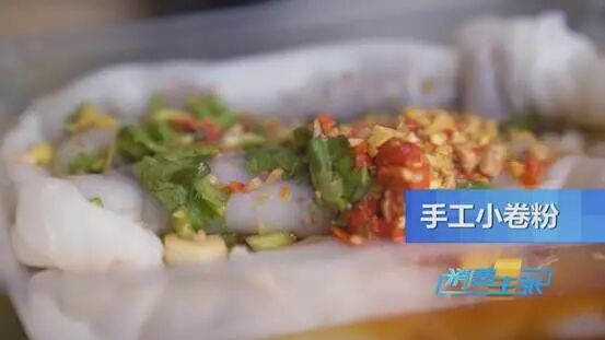 大米磨成的米浆,舀上一勺,只需要15秒,就能蒸出一张晶莹剔透的粉皮。裹上各种馅料,浇上料汁,纯手工的小卷粉让人垂涎欲滴。