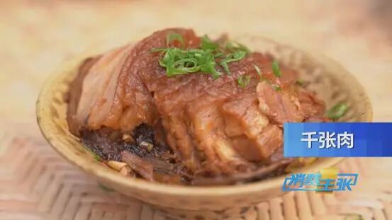 第二碗是千张肉,用猪肚皮上的三线肉做成,煮熟之后抹上蜂蜜,炸成金黄改刀,下面再垫上本地的干腌菜。酸甜结合,香气浓郁。